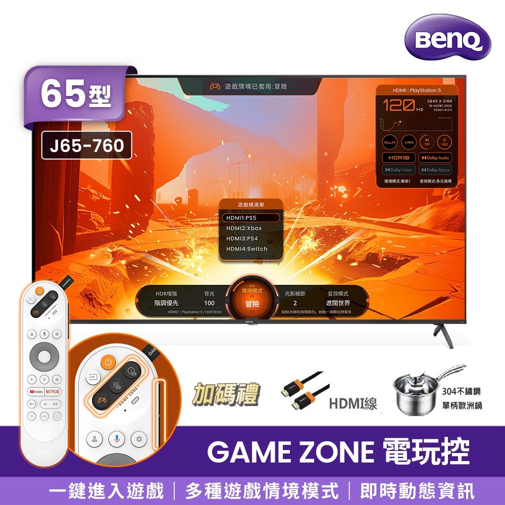 【BenQ】J65-760 4K 144Hz量子點遊戲GoogleTV連網大型液晶顯示器送HDMI線、單柄歐洲鍋【BenQ】J65-760 4K 144Hz量子點遊戲GoogleTV連網大型液晶顯示器送HDMI線、單柄歐洲鍋TVsBenQ 明基大型液晶旗艦館 | 特約授權