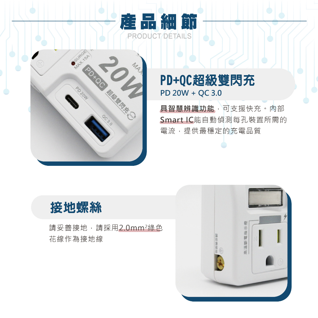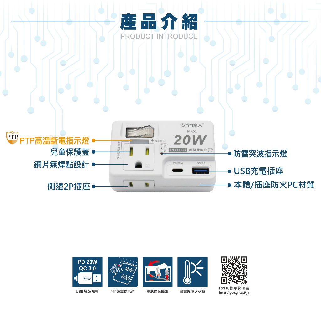 【安全達人】1開2插3P+2P 20W USB超級閃充分接器(壁插)R-61PLC