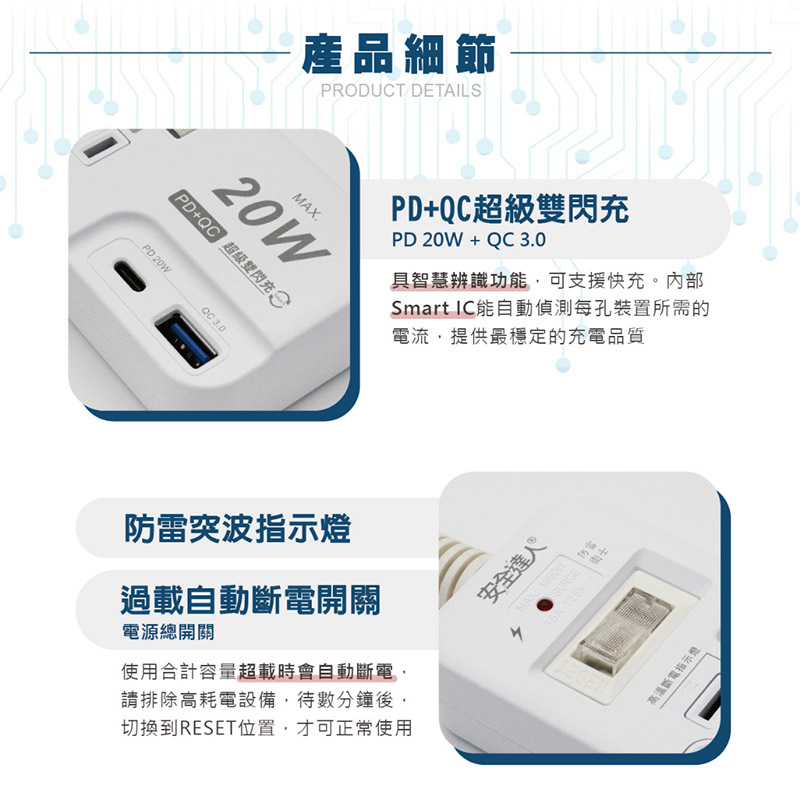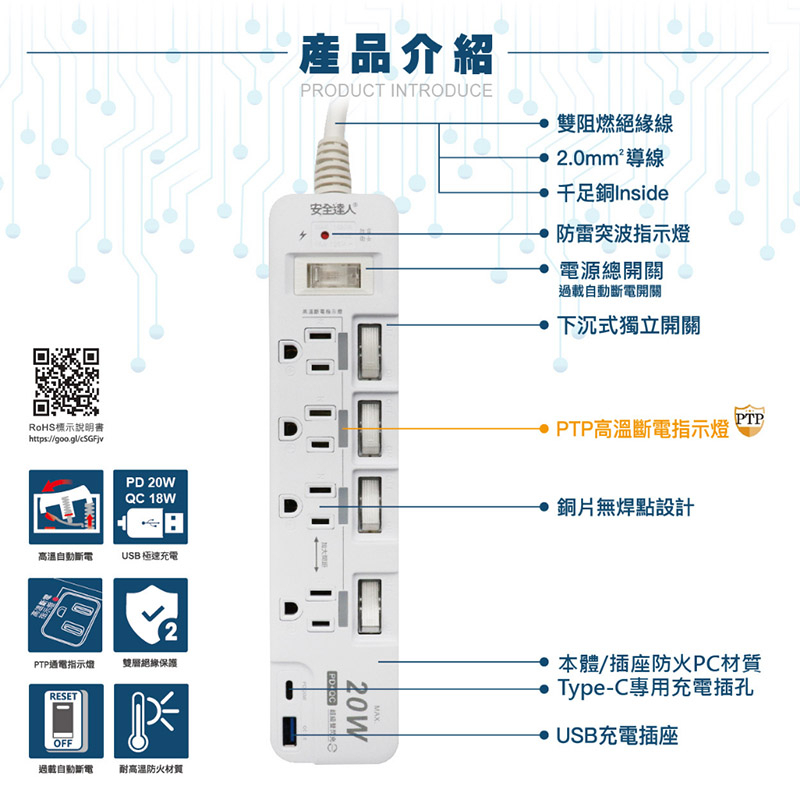 【安全達人】5開4插3P 20W USB超級閃充延長線 K-60PL【安全達人】5開4插3P 20W USB超級閃充延長線 K-60PLElectric Sockets & Extension CordsAll Sale電器共和國