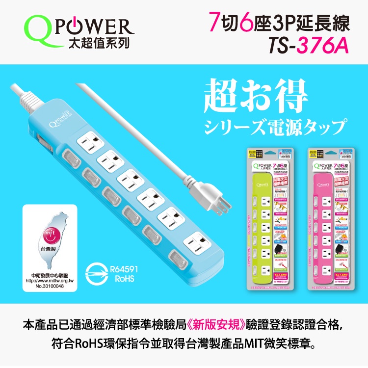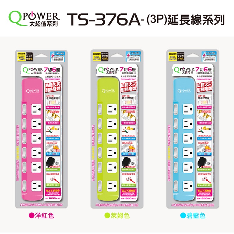 QPower 太順電業 台灣製 7切6座 3孔延長線【現貨】多尺寸 延長線 安全防火 耐用 耐摔 自動斷電1.2米,碧藍色|1.2米,萊姆色|1.2米,洋紅色|1.8米,碧藍色|1.8米,萊姆色|1.8米,洋紅色|2.7米,碧藍色|2.7米,萊姆色|2.7米,洋紅色Electric Sockets & Extension Cordsaibo 3C生活館