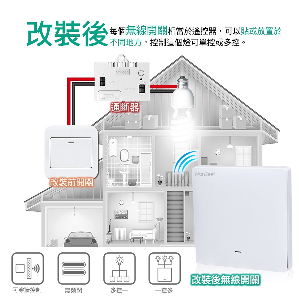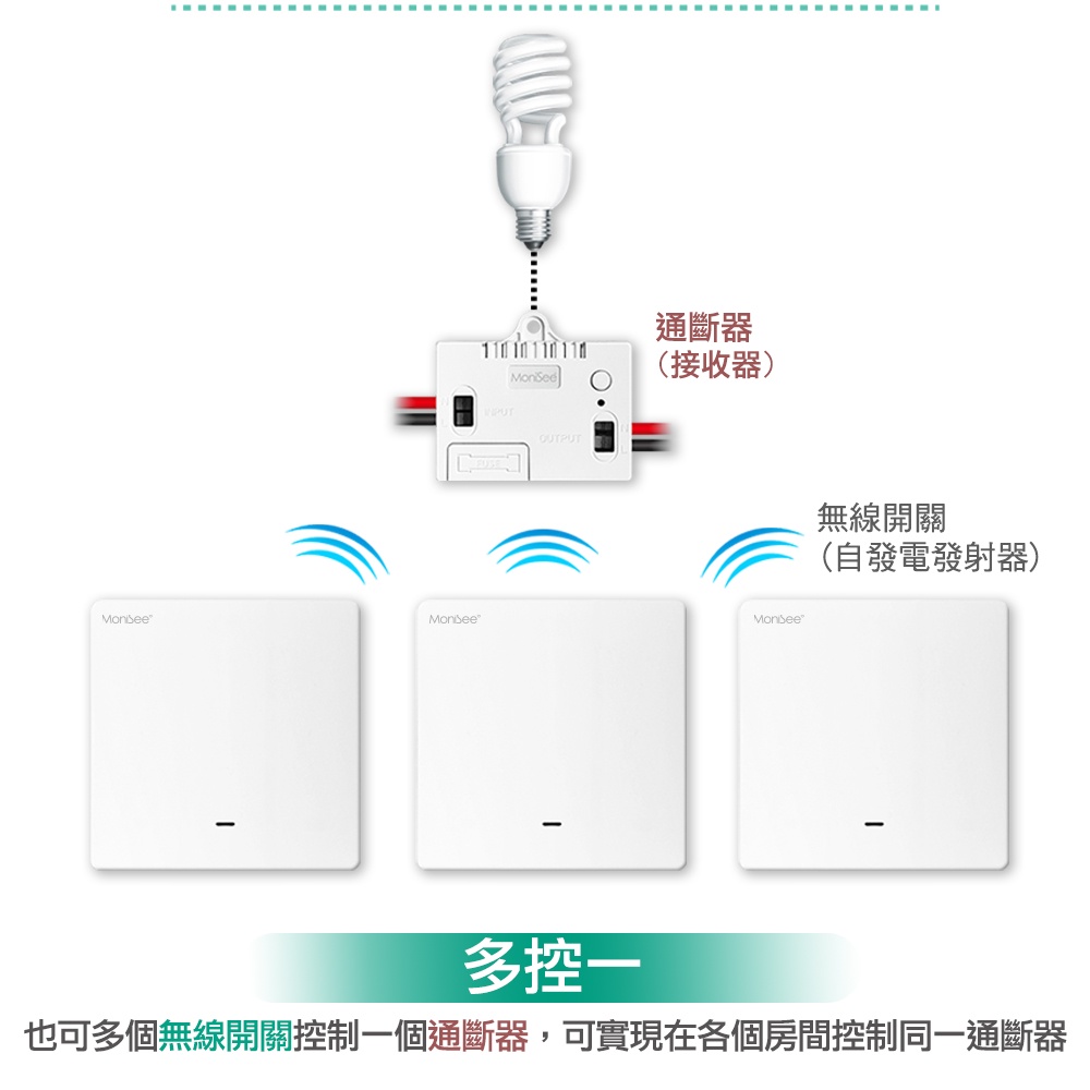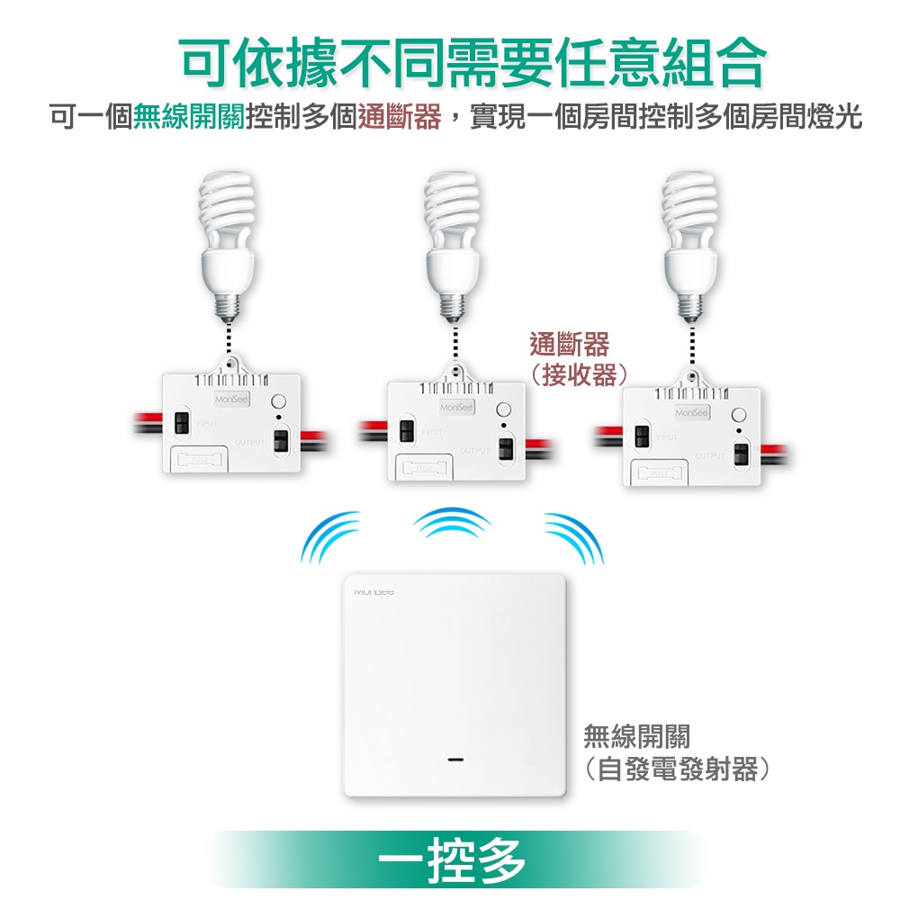 【MoniSee 莫尼希】智能無線開關燈光通斷器(電池款/套組/一對一) 無線控制/無線通斷/燈光控制/開關控制套組/電池款/1個一路發射器+1個接收器|擴充/電池款/2個一路發射器+1個接收器|擴充/電池款/1個一路發射器+2個接收器|擴充/電池款/2個一路發射器+2個接收器Switchesatake台灣官方旗艦店