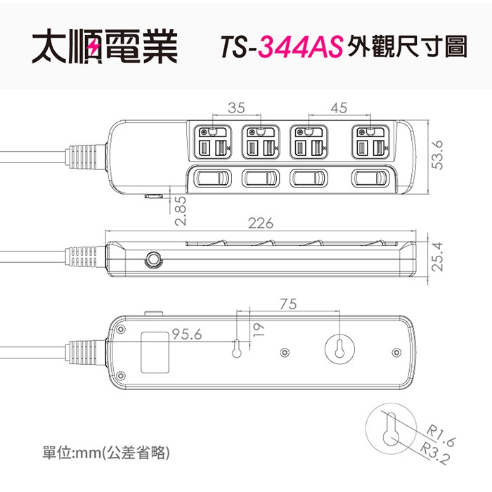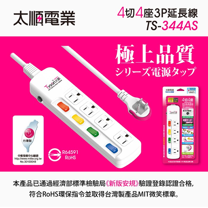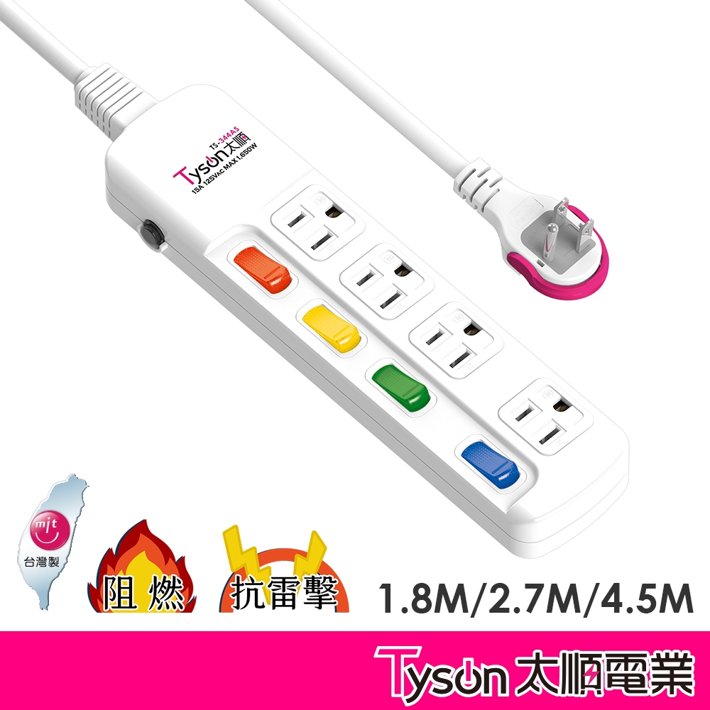 Tyson太順電業 台灣製 4切4座 3孔延長線【現貨】多尺寸 344AS 延長線 安全防火 耐用 耐摔 自動斷電1.8米|2.7米|4.5米Electric Sockets & Extension Cordsaibo 3C生活館