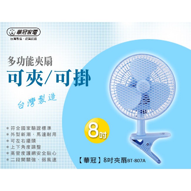 華冠牌 8吋迷你夾扇 BT-807A 台灣製造 小電扇華冠牌 8吋迷你夾扇 BT-807A 台灣製造 小電扇CoolingAll Sale電器共和國