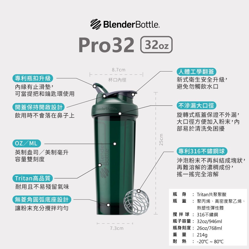 【BlenderBottle】Tritan搖搖杯〈Pro32系列〉32oz/946ml|運動水壺蔚藍|海洋藍|煙灰|叢林綠|幻影黑|珊瑚橘|銀河灰Cups, Mugs & GlassesBlenderBottle美國官方授權