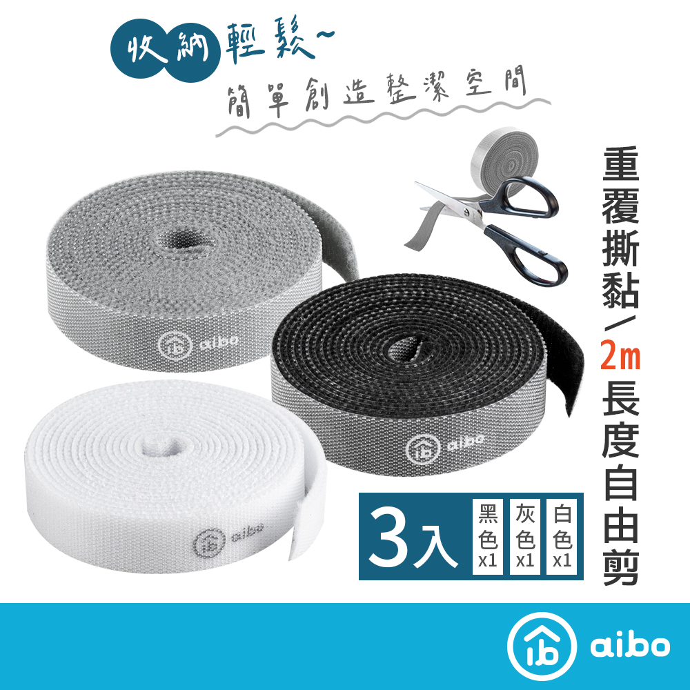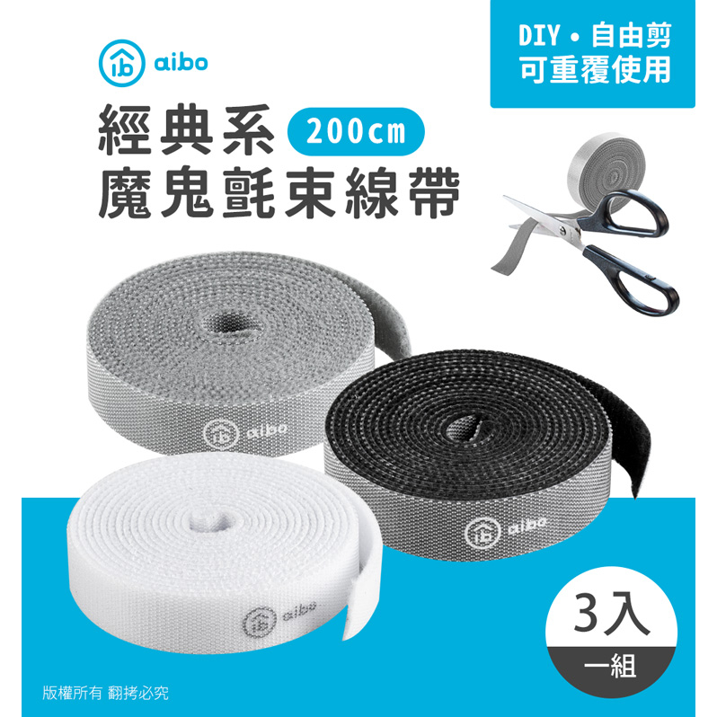 aibo 自行剪裁【3入組】魔鬼氈束線帶 1捲200cm【現貨】 綑帶 綁帶 理線帶 DIY剪裁 束線帶 魔鬼氈 束帶黑白灰 組合Desk Organizersaibo 3C生活館