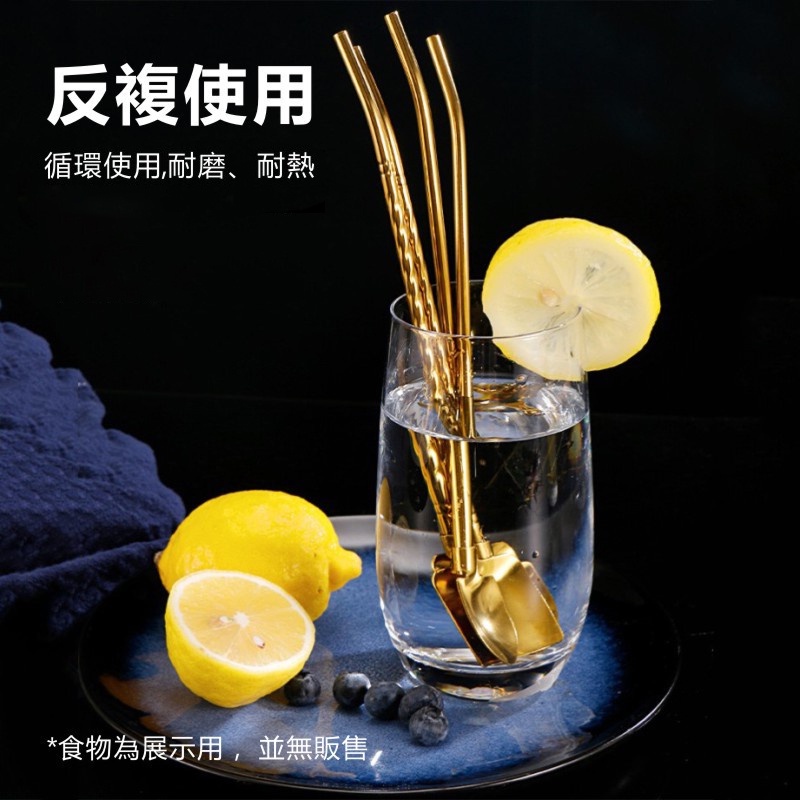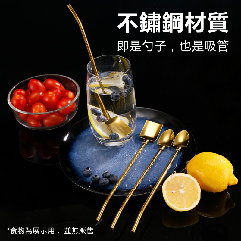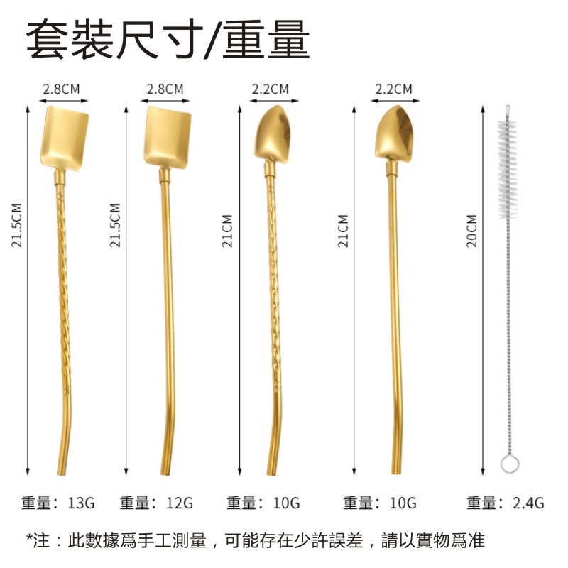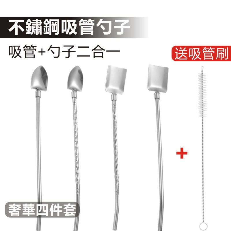 兩用湯匙吸管(四入) 鏟子造型吸管 適用飲料/冰淇淋/咖啡攪拌/甜點 不鏽鋼吸管兩用湯匙 攪拌棒 攪拌匙 茶匙 湯勺四件套-原色+吸管刷|四件套-金色+吸管刷StrawsADHIL旗艦店