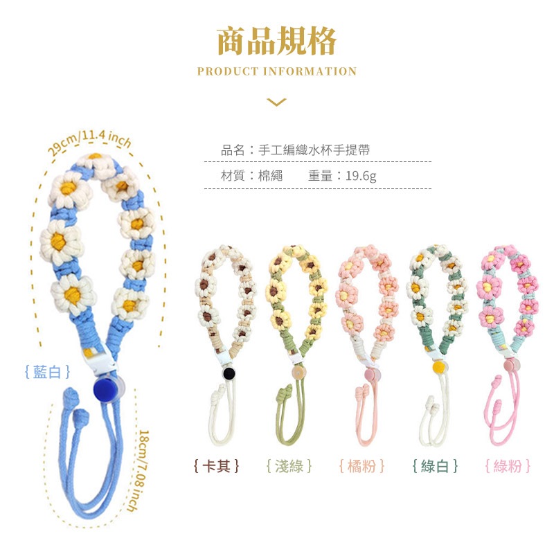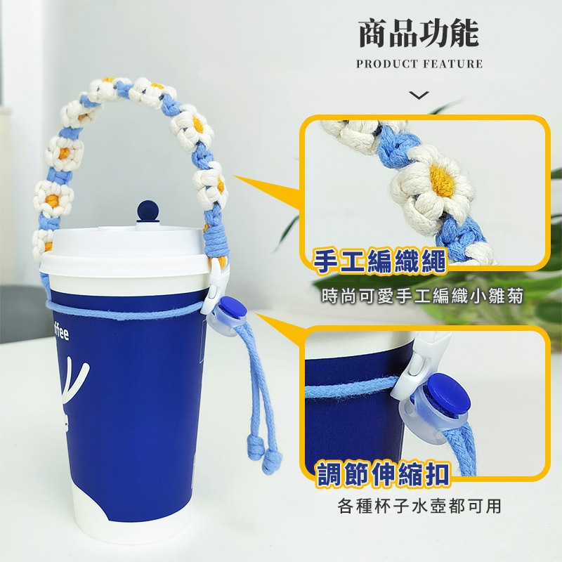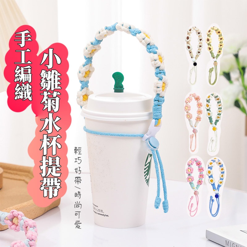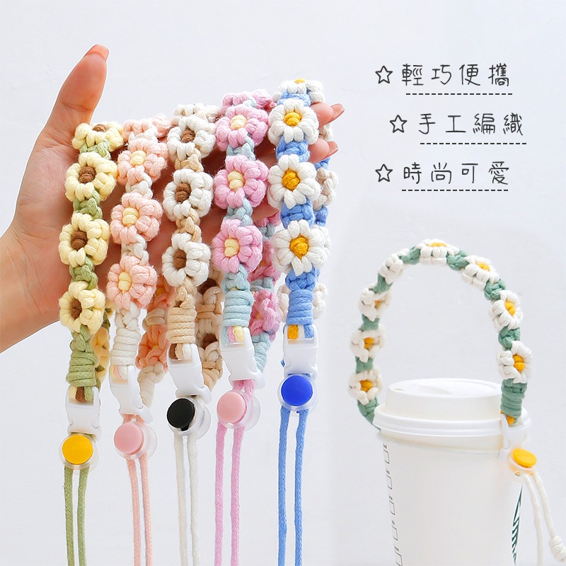 【A-MORE】手工編織小雛菊水杯提帶 飲料提繩 奶茶杯提繩 飲料提繩 編織咖啡杯手提帶 傘繩杯套 水杯繩 環保杯套卡其|藍白|淺綠|橘粉|綠白|綠粉|韓粉|黑白|復古紫|紫色|淡黃|秋黃|暗紅|深卡其OthersA-More創意