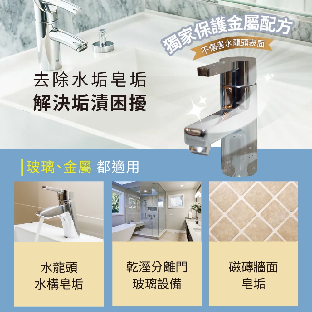 黃金盾水垢皂垢清潔劑 (400ml) 無腐蝕性、溫和不刺鼻/60秒淨除水垢皂垢,抗菌防霉黃金盾水垢皂垢清潔劑 (400ml) 無腐蝕性、溫和不刺鼻/60秒淨除水垢皂垢,抗菌防霉Cleaning Agents【HOME WORKING元艇|居家生活|EKO垃圾桶】
