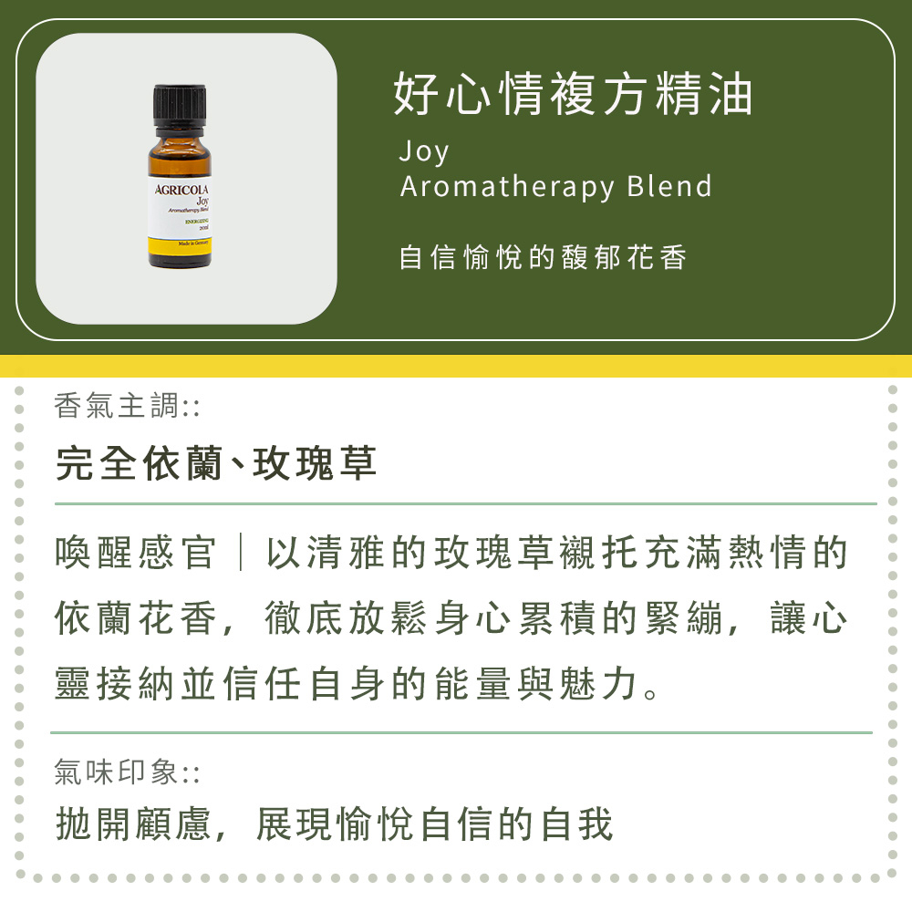 【AGRICOLA植物者】好心情複方精油 20ml – 德國原裝進口 純植物萃取天然擴香 自信花香調【AGRICOLA植物者】好心情複方精油 20ml – 德國原裝進口 純植物萃取天然擴香 自信花香調Essential OilsAGRICOLA植物者 官方旗艦店