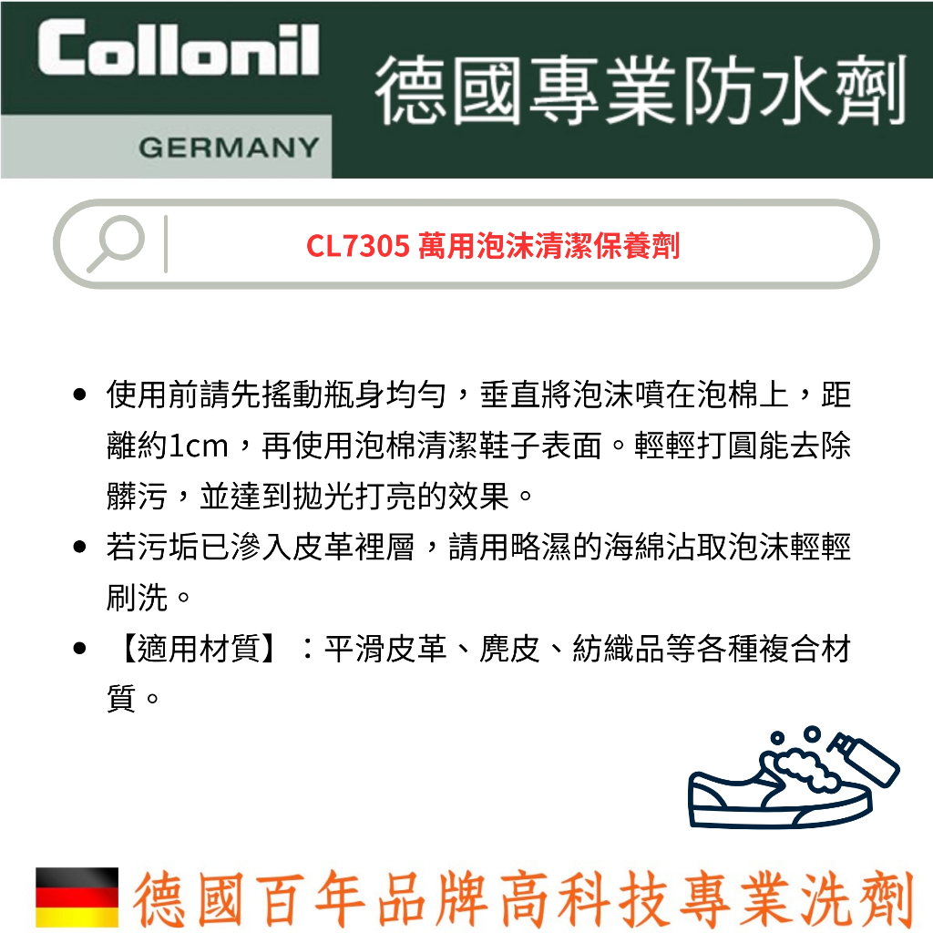 德國Collonil(科倫尼) CL7305 萬用泡沫清潔保養劑 鞋用清潔 包包清潔 沙發清潔 泡沫清潔德國Collonil(科倫尼) CL7305 萬用泡沫清潔保養劑 鞋用清潔 包包清潔 沙發清潔 泡沫清潔Cleaning AgentsAntarctica 專業戶外/健身/運動/跑步/休閒旅行家