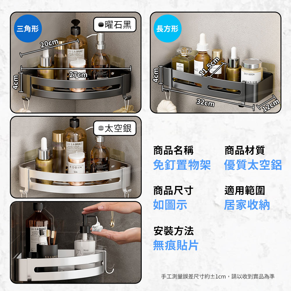 浴室置物架 無痕免釘貼【ARZ】【E108】瀝水收納架 太空鋁 三角置物架 掛勾 廁所置物架 牆角置物架 浴室收納架三角形(太空銀)|三角形(曜石黑)|長方形(太空銀)|長方形(曜石黑)Bathroom Racks & CabinetsARZ行動商城