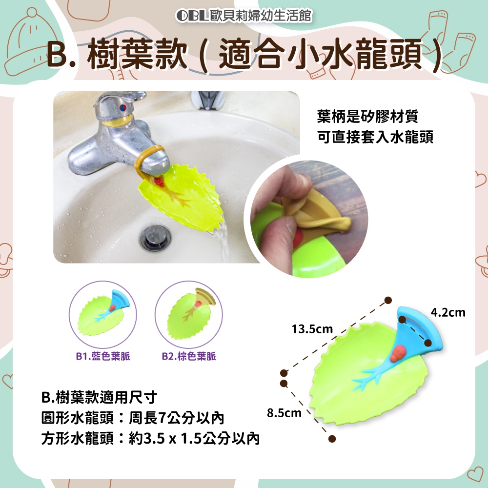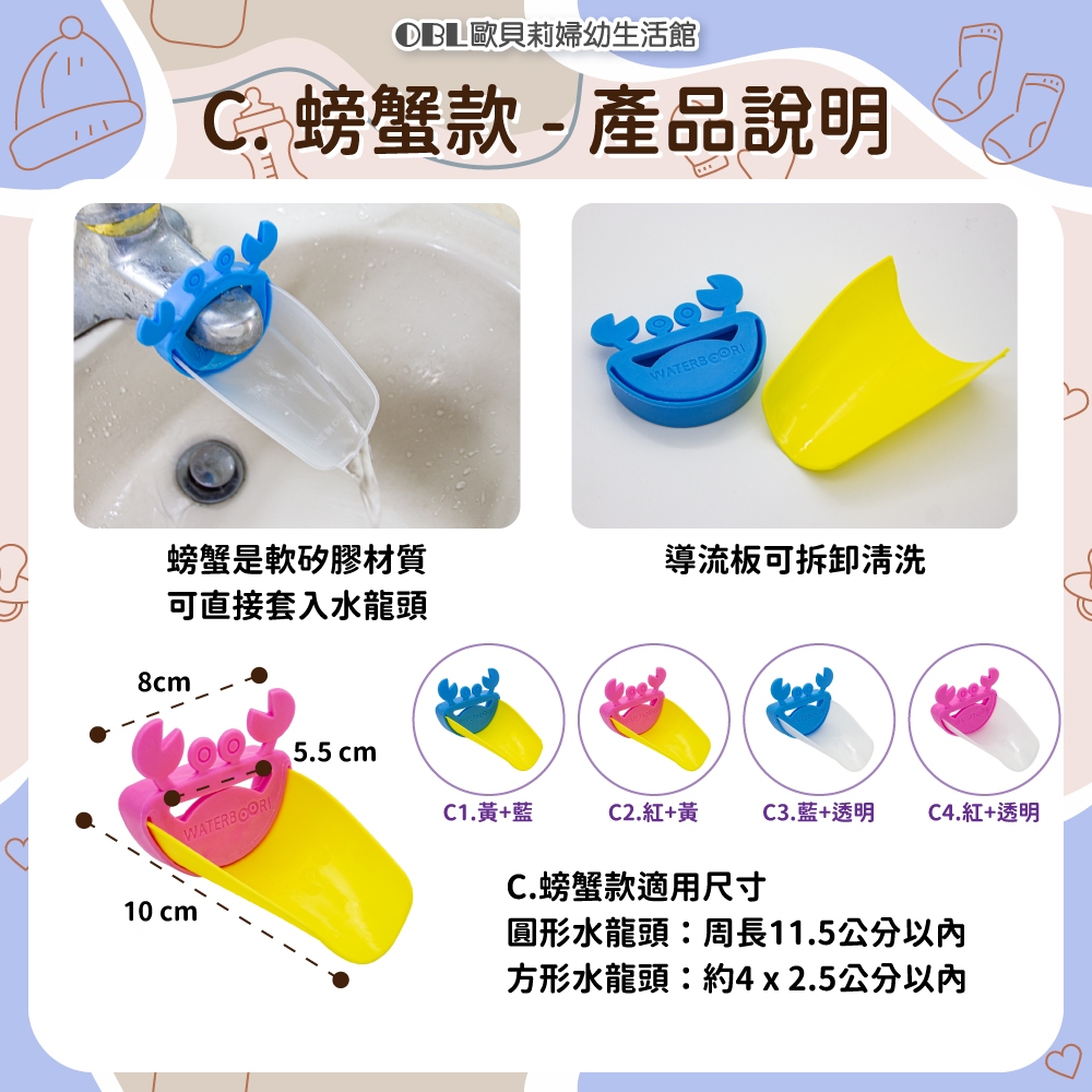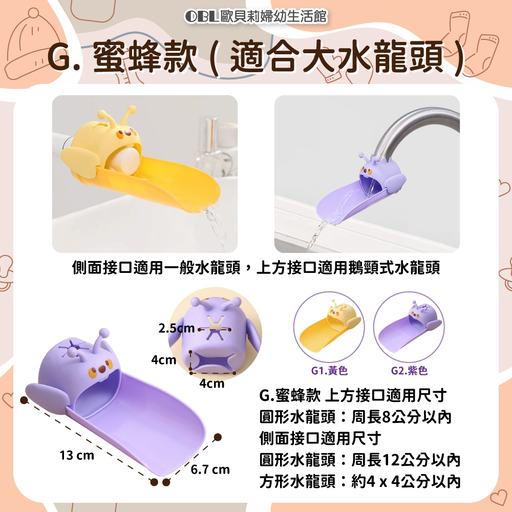 兒童洗手延伸器 兒童水龍頭延伸器 寶寶洗手延長器 加長 矽膠水嘴導水槽 兒童獨立神器《OBL歐貝莉》A1.動物款-藍色大象|A2.動物款-黃色鴨子|B1.樹葉款-藍色葉脈|B2.樹葉款-棕色葉脈|C1.螃蟹款-藍+黃|C2.螃蟹款-紅+黃|C3.螃蟹款-藍+透明|C4.螃蟹款-紅+透明|E1.兩用款-白色|E2.兩用款-蒂芬妮藍|D1.可調兩用款-灰色|F2.兔兔款-黃色|F3.兔兔款-橘色|F1.兔兔款-粉色|E3.兩用款-深藍色|F4.兔兔款-綠色|G1.蜜蜂款-黃色|G2.蜜蜂款-紫色|H1.魚魚水車款-黃色|H2.魚魚水車款-紫色Sinks & Water Taps【OBL 歐貝莉】歐貝莉婦幼生活館