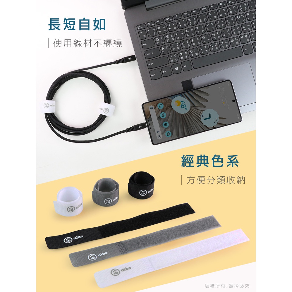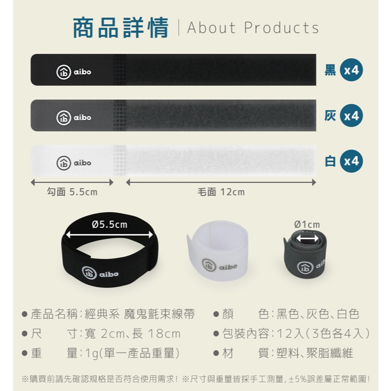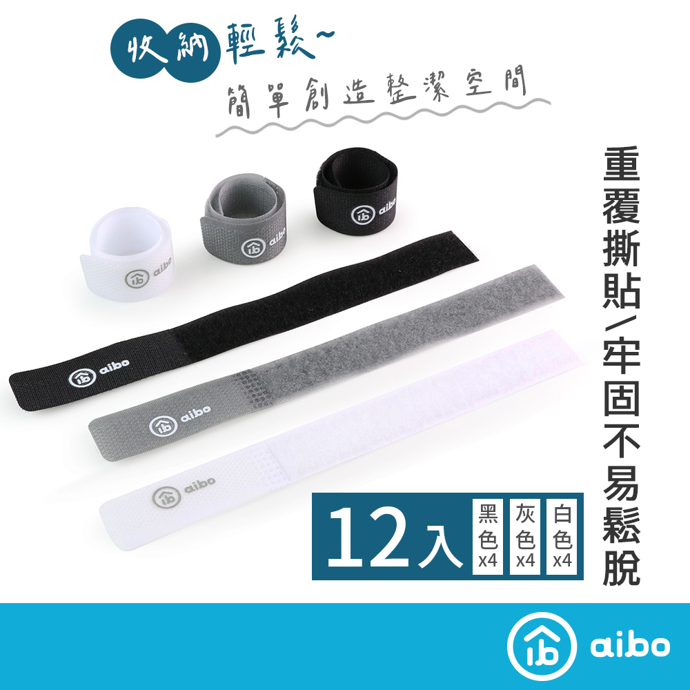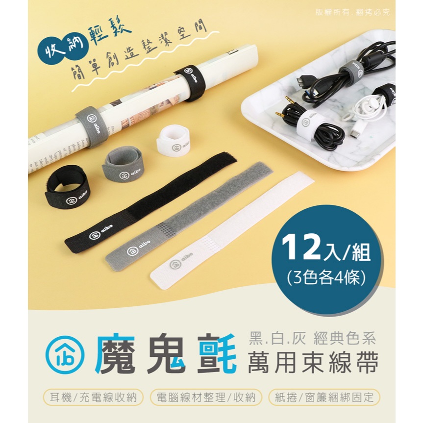 aibo「12入」萬用魔鬼氈束線帶 【現貨】 萬用束帶 魔鬼氈束帶 束帶 線帶 魔鬼氈 束線帶 綁帶 理線帶 綑帶黑白灰12入組Desk Organizersaibo 3C生活館