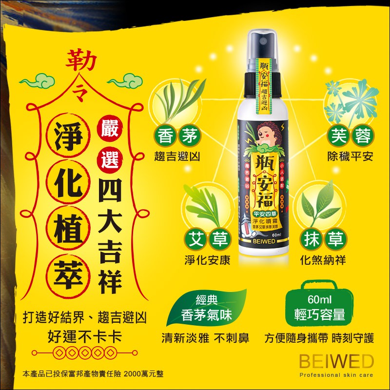 BEIWED 瓶安福 – 平安四草淨化噴霧 60mlBEIWED 瓶安福 – 平安四草淨化噴霧 60mlOthersBEIWED 貝薇美學官方旗艦店