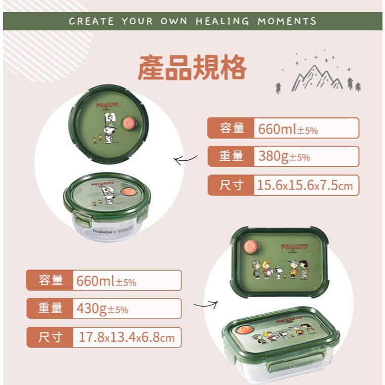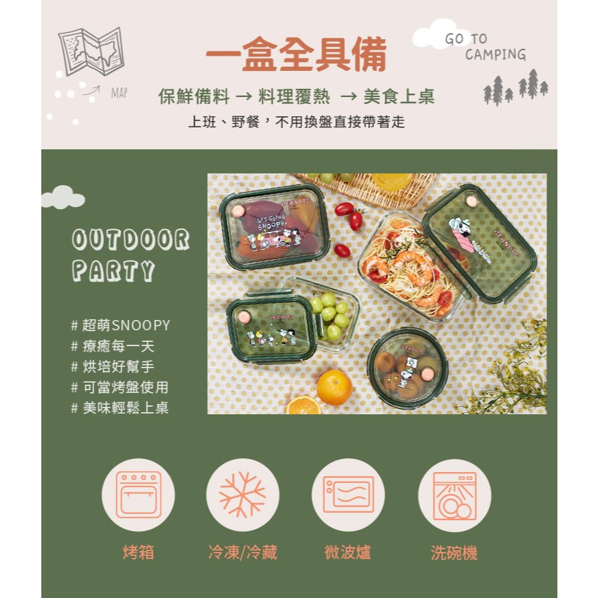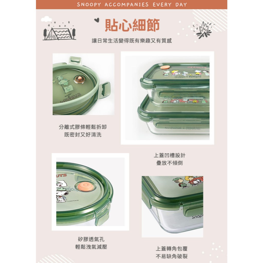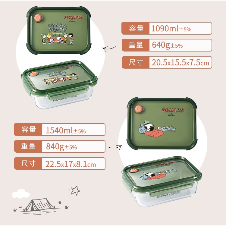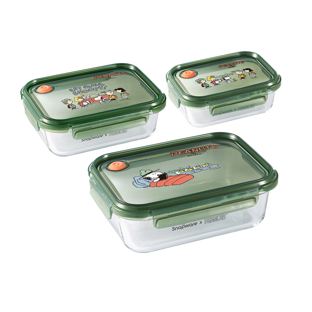 新品上市【康寧 Snapware】SNOOPY史努比露營趣耐熱玻璃/可微波/烤箱/保鮮盒-三件組