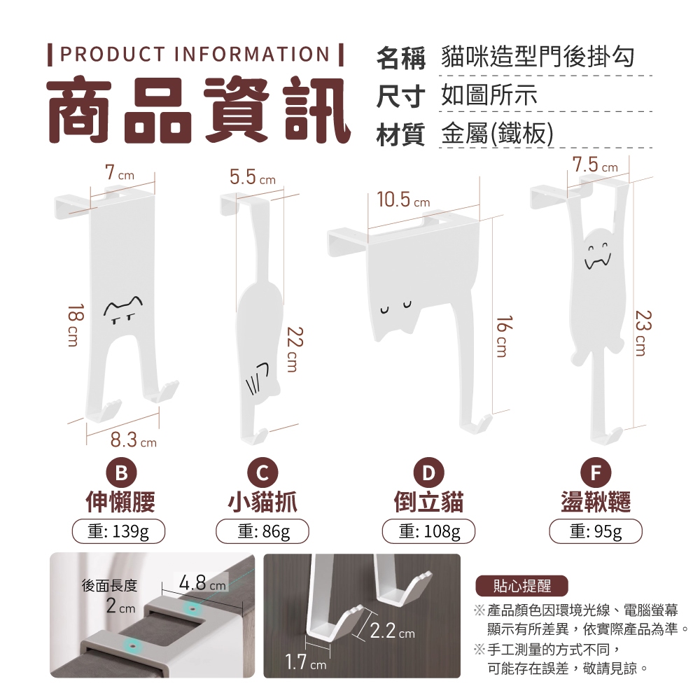 貓咪門後掛勾 掛勾 收納 門後造型掛勾 免釘掛勾 免釘掛衣架 貓貓掛勾 可愛掛勾 金屬掛勾【小麥購物】【G410】伸懶腰 ( B )|小貓抓 ( C )|倒立貓 ( D )|盪鞦韆 ( F )Hooks 小麥購物
