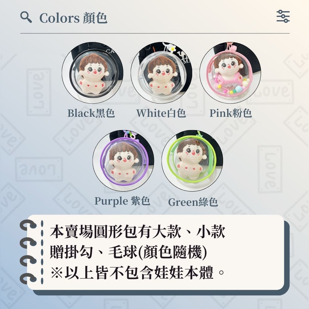 痛包 娃包 曬娃包 圓形小包、大包 外出溜娃包 棉花娃娃包透明PVC包 明星公仔包 5色可選大款,粉色(贈掛勾+隨機毛球顏色)|大款,紫色(贈掛勾+隨機毛球顏色)|大款,綠色(贈掛勾+隨機毛球顏色)|小款,黑色(贈掛勾+隨機毛球顏色)|小款,白色(贈掛勾+隨機毛球顏色)|小款,粉色(贈掛勾+隨機毛球顏色)|小款,紫色(贈掛勾+隨機毛球顏色)|小款,綠色(贈掛勾+隨機毛球顏色)|大款,黑色(贈掛勾+隨機毛球顏色)|大款,白色(贈掛勾+隨機毛球顏色)Bliss ~ 各國流行包款 泰國原廠化妝保養品