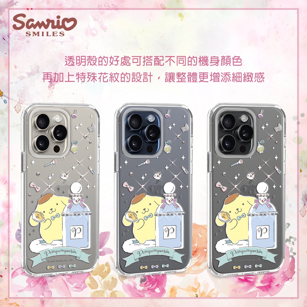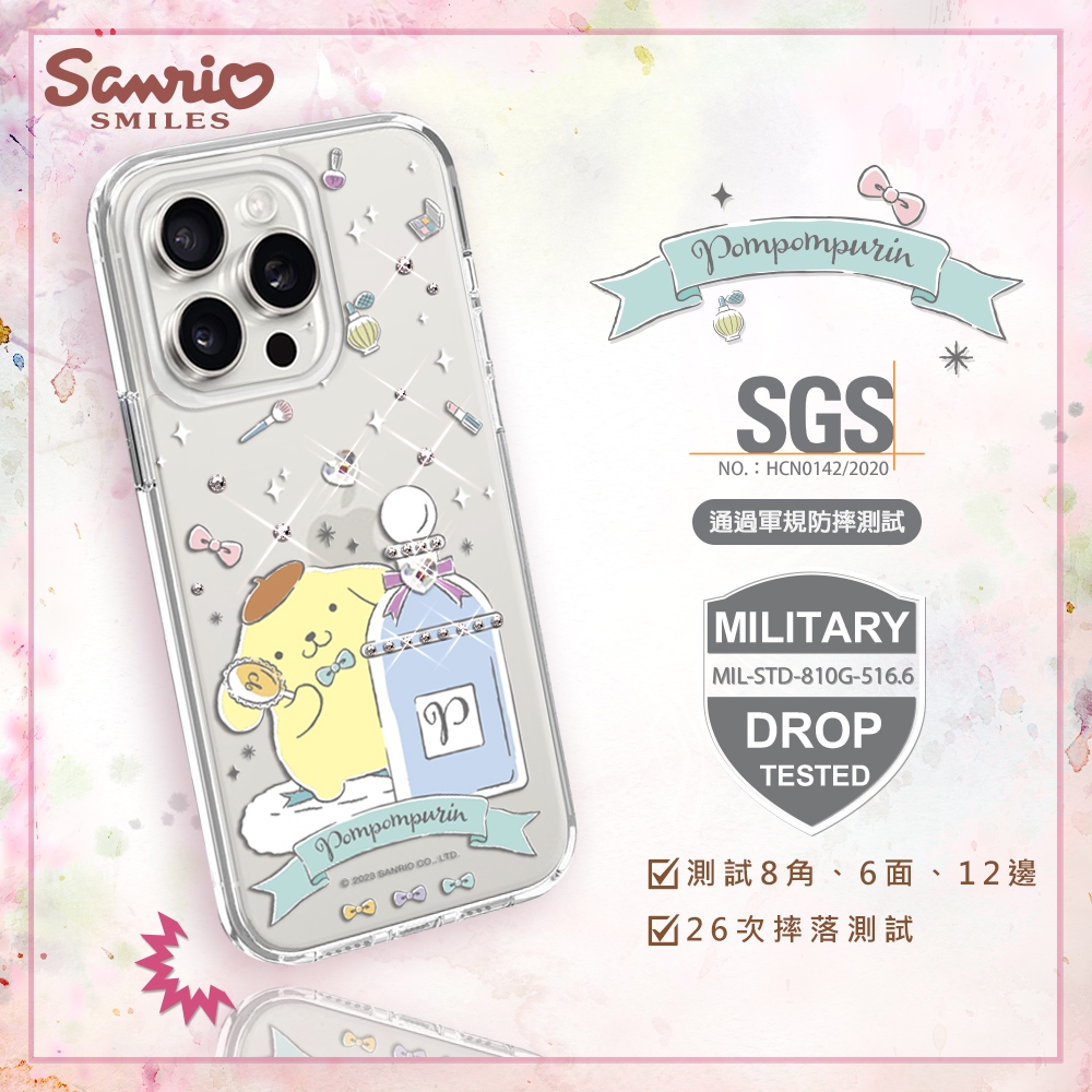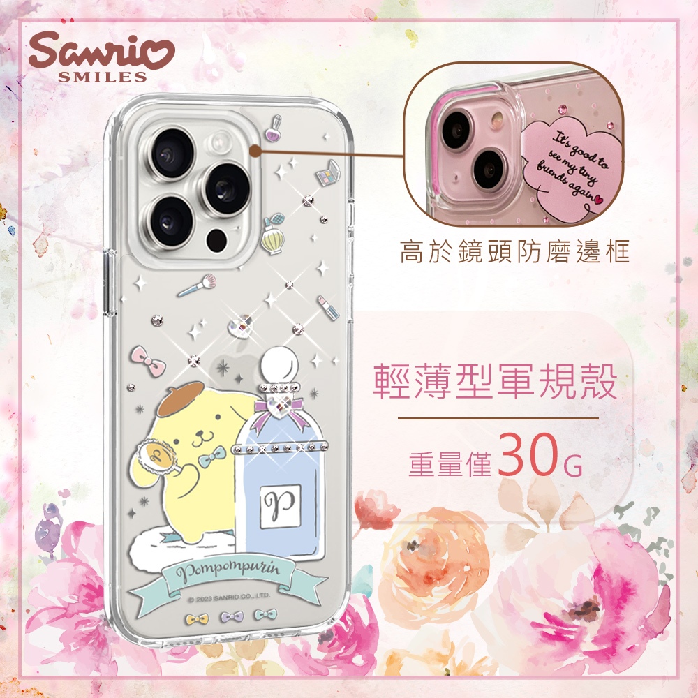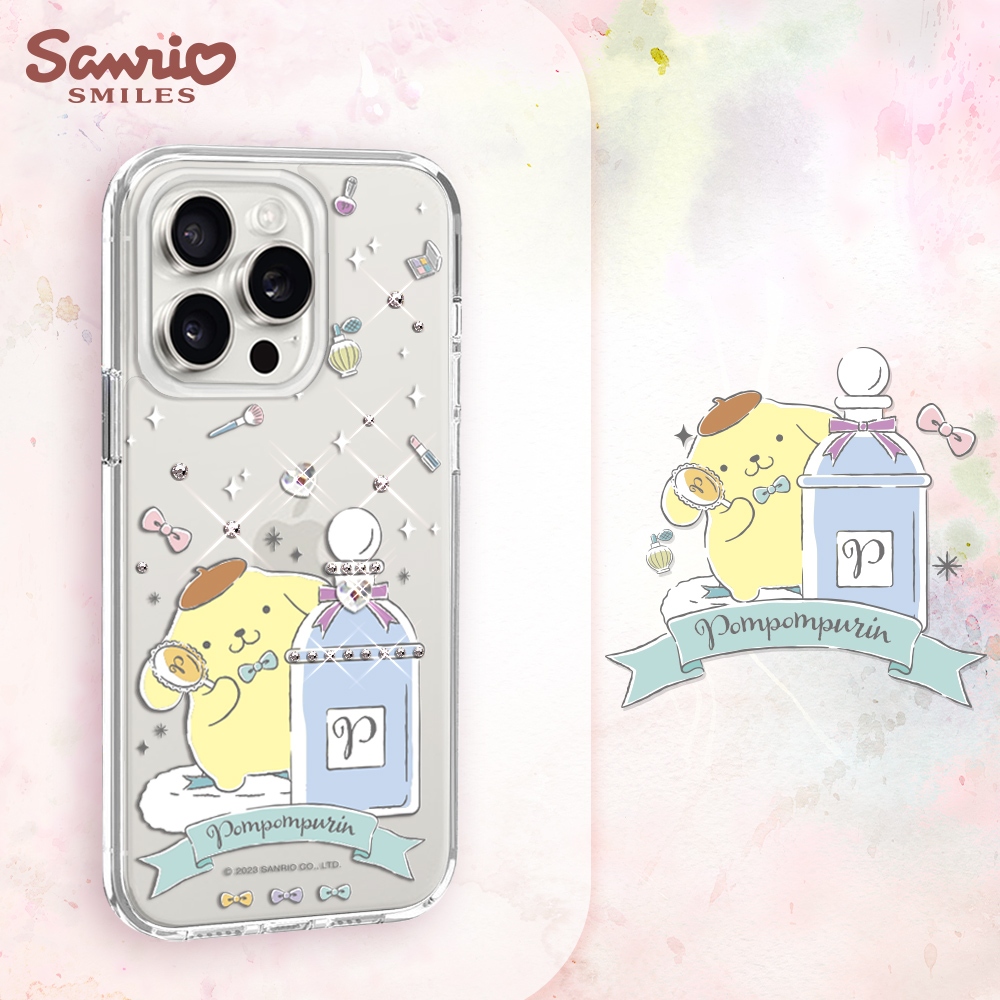 • 三麗鷗 iPhone 16/15/14/13/12/11系列 輕薄軍規防摔水晶彩鑽手機殼-香水布丁狗