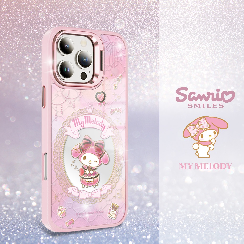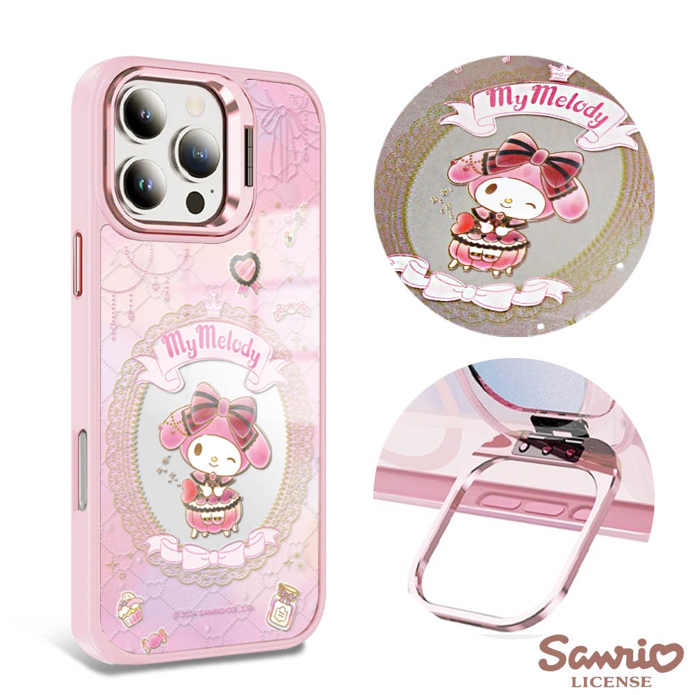 • 三麗鷗iPhone16/15/14/13/S25/S24/S23系列 軍規防摔合金框隱形立架鏡面磁吸殼-魔鏡美樂蒂-粉框