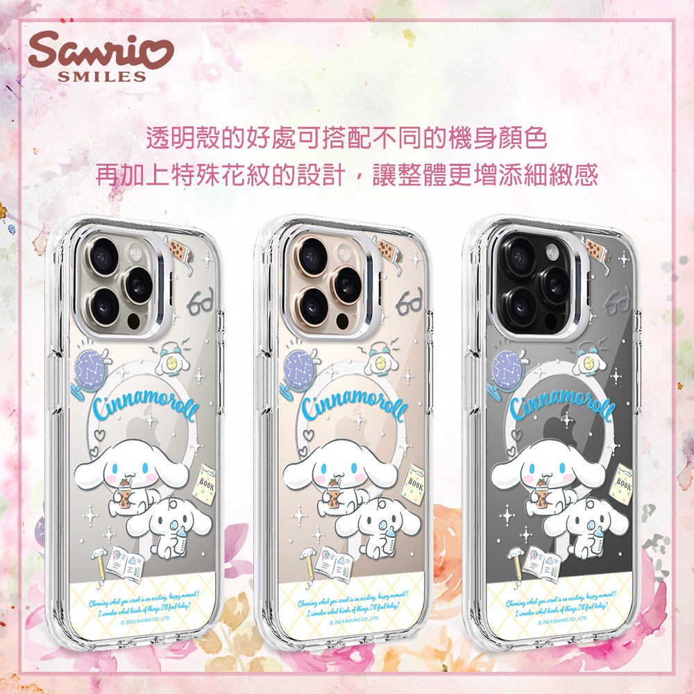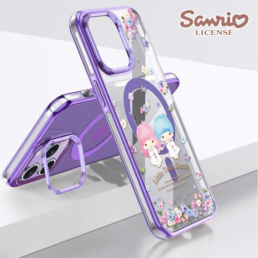 • 三麗鷗 iPhone 16/15/14/13系列 抗黃化磁吸金屬框隱形立架殼-花語雙子星-電鍍紫