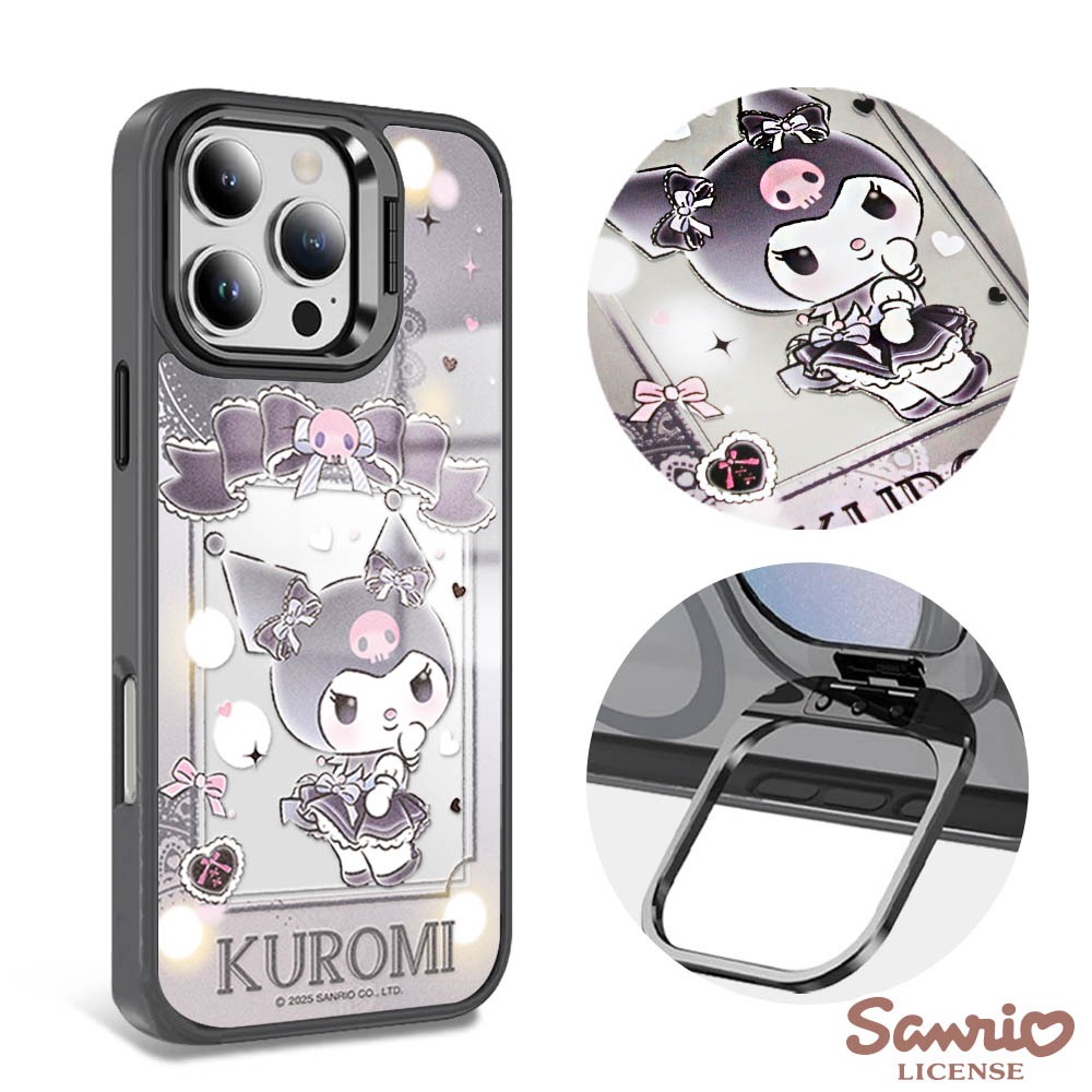 • 三麗鷗 iPhone16/15/14/13/S24/S23系列 軍規防摔合金框隱形立架鏡面磁吸手機殼-蕾絲酷洛米B-黑框