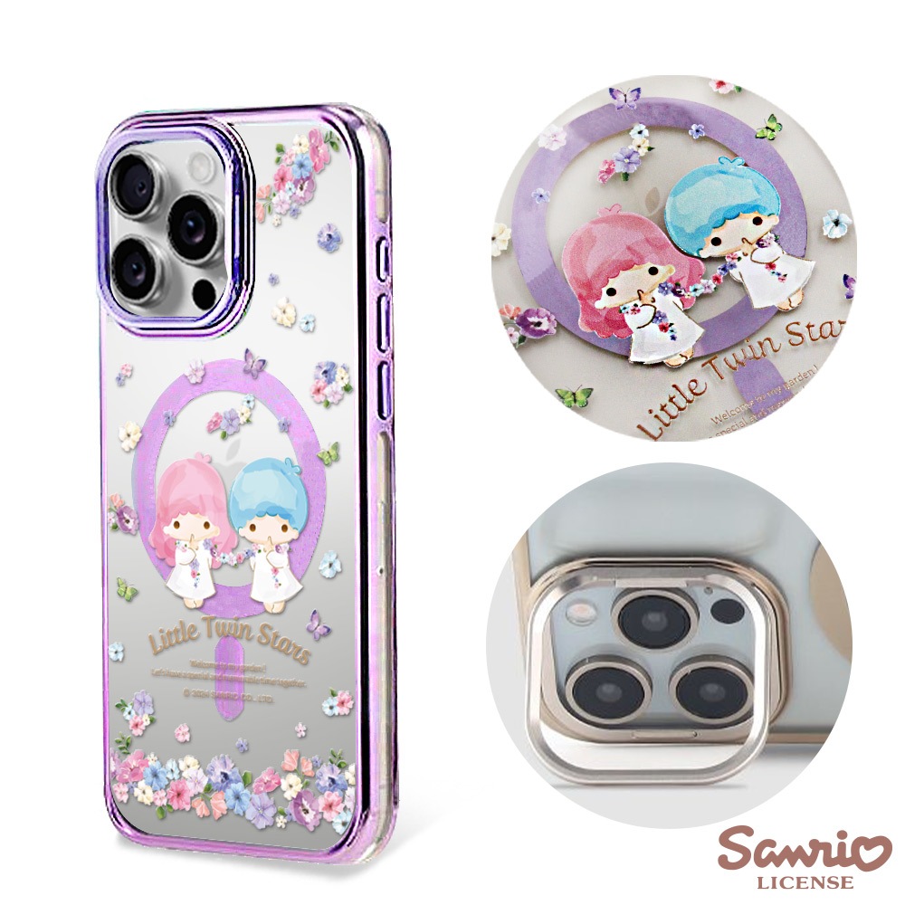 三麗鷗 iPhone 16/15/14/13系列 抗黃化磁吸金屬框隱形立架殼-花語雙子星-電鍍紫