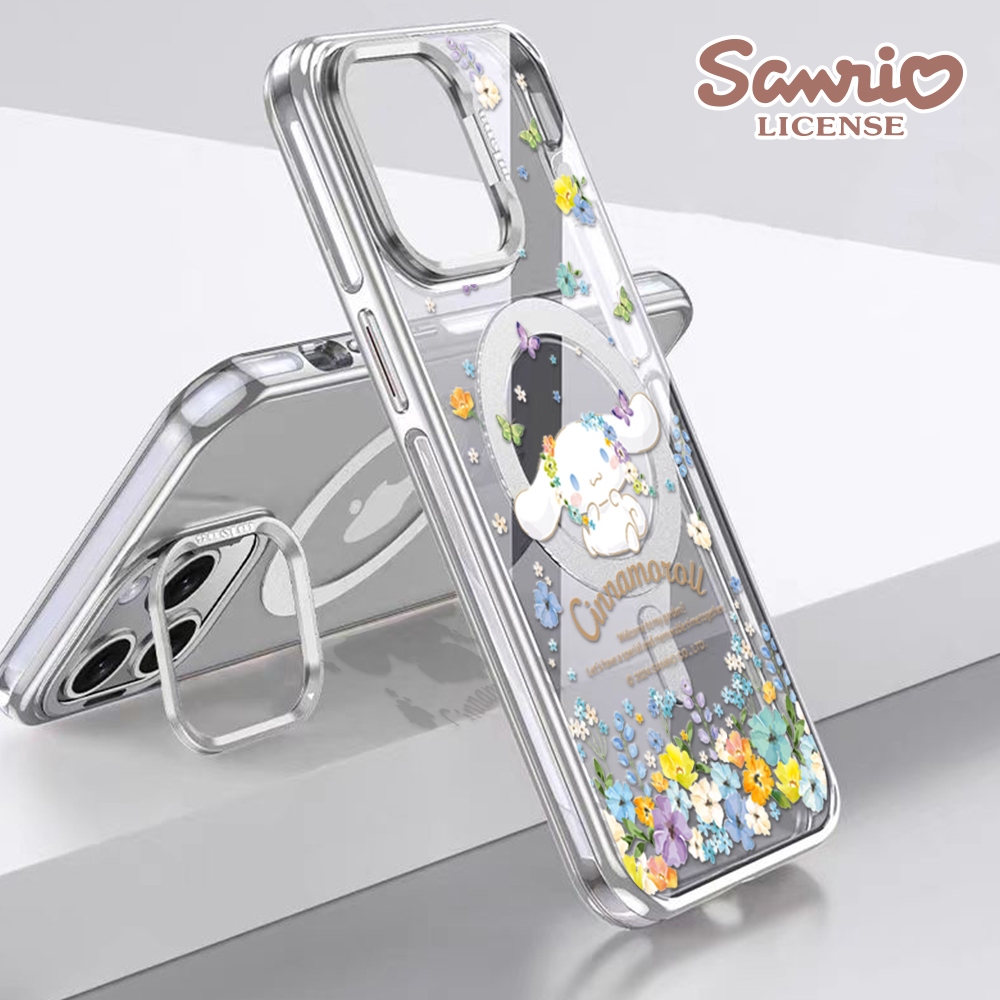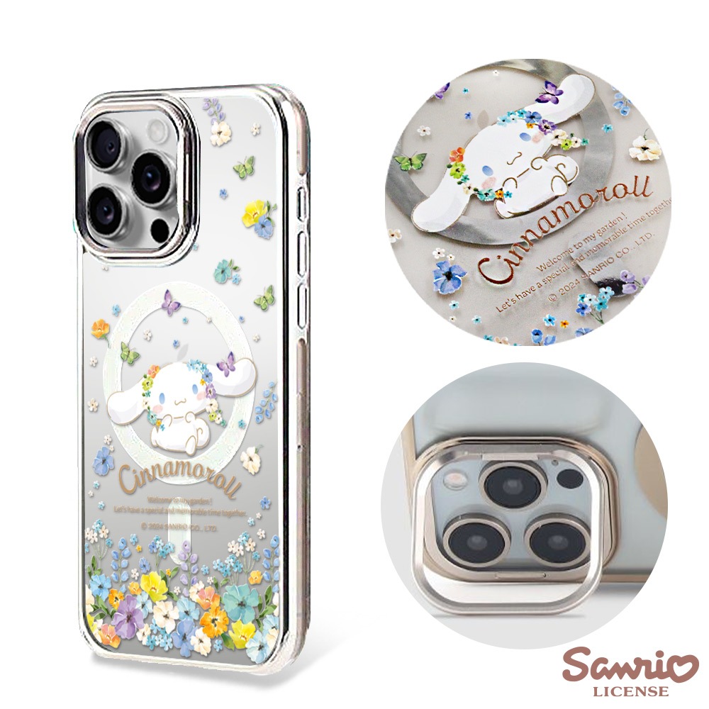 • 三麗鷗 iPhone 16/15/14/13系列 抗黃化磁吸金屬框隱形立架殼-花語大耳狗-電鍍銀