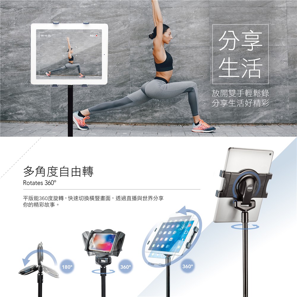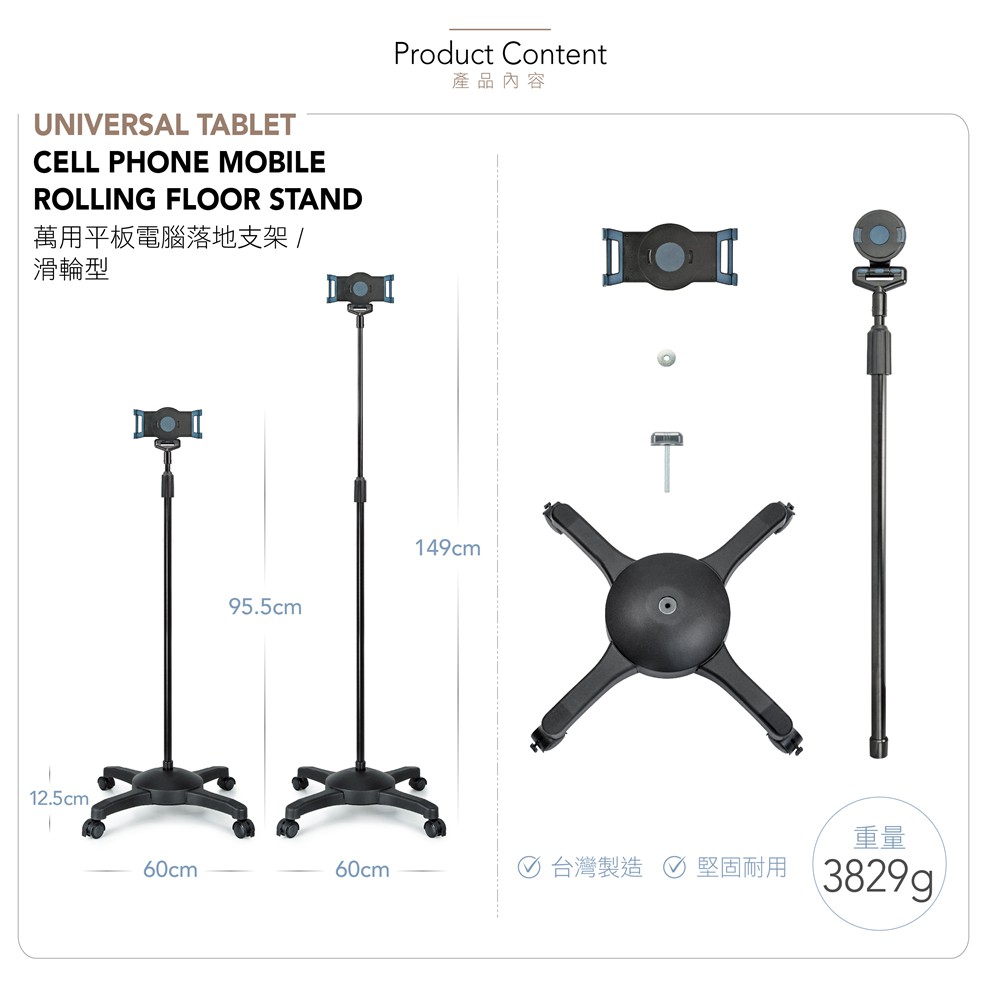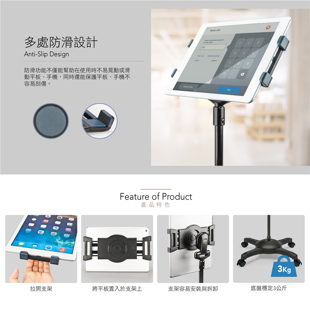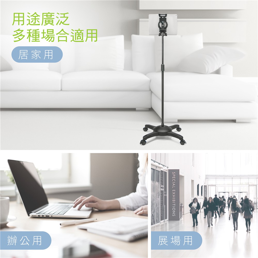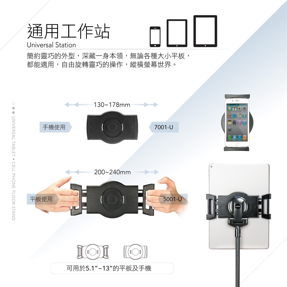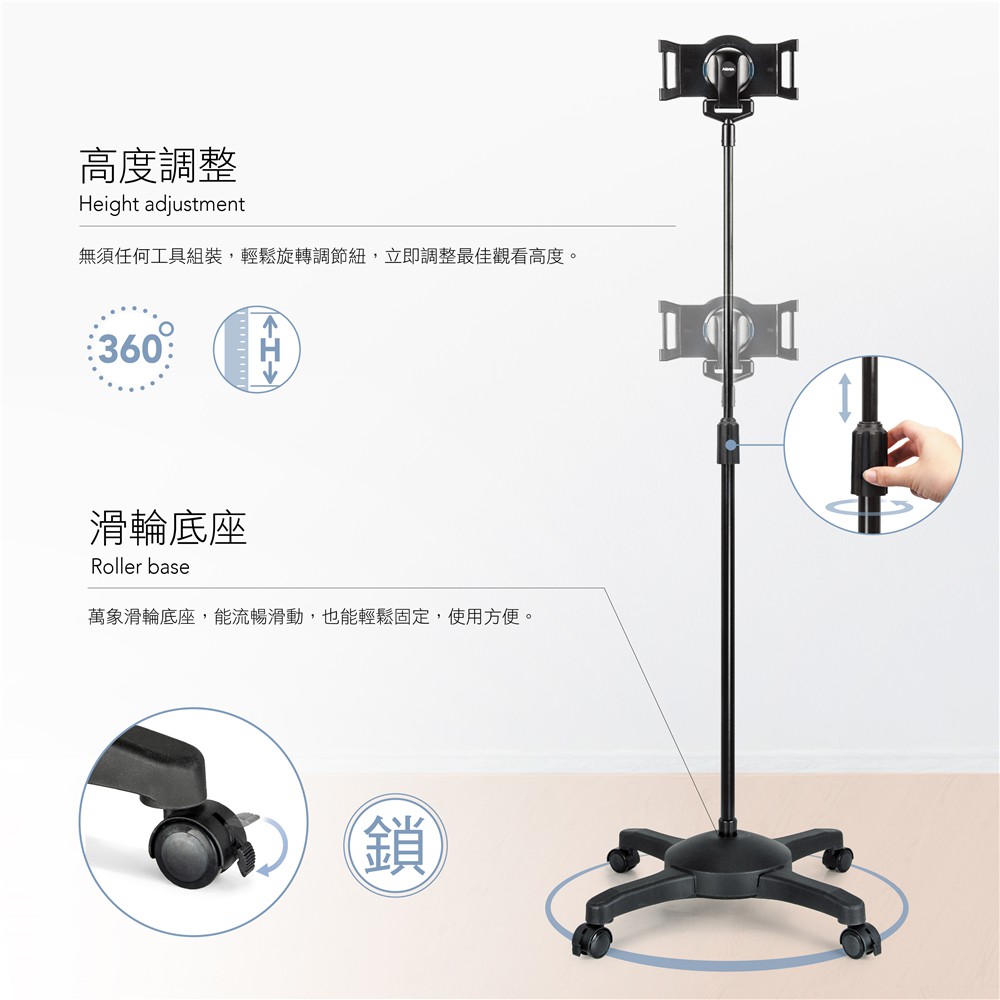 AIDATA 愛得他 5.1~13吋萬用平板電腦落地支架/滑輪型 US-5123RB 附贈7001-U夾具【黑色】滑輪落地支架/附7001-U夾具Phone GripsAIDATA 愛得他