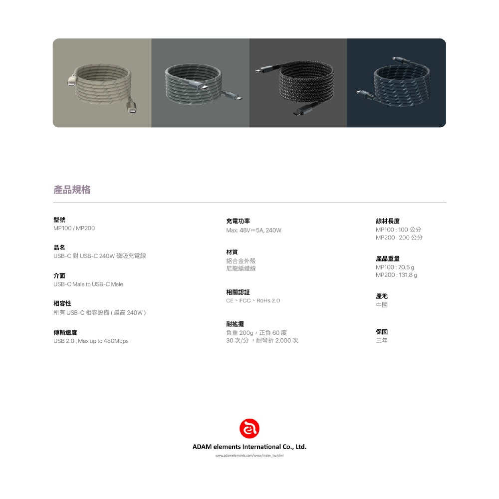 【ADAM 亞果元素】MP100 / MP200 USB-C 對 USB-C 240W 磁吸充電線 品牌旗艦店MP100 (100 cm) – 黑|MP100 (100 cm) – 藍|MP100 (100 cm) – 灰|MP100 (100 cm) – 鈦|MP200 (200 cm) – 黑|MP200 (200 cm) – 藍|MP200 (200 cm) – 灰|MP200 (200 cm) – 鈦Cables, Chargers & ConvertersADAM STORE 亞果元素旗艦店