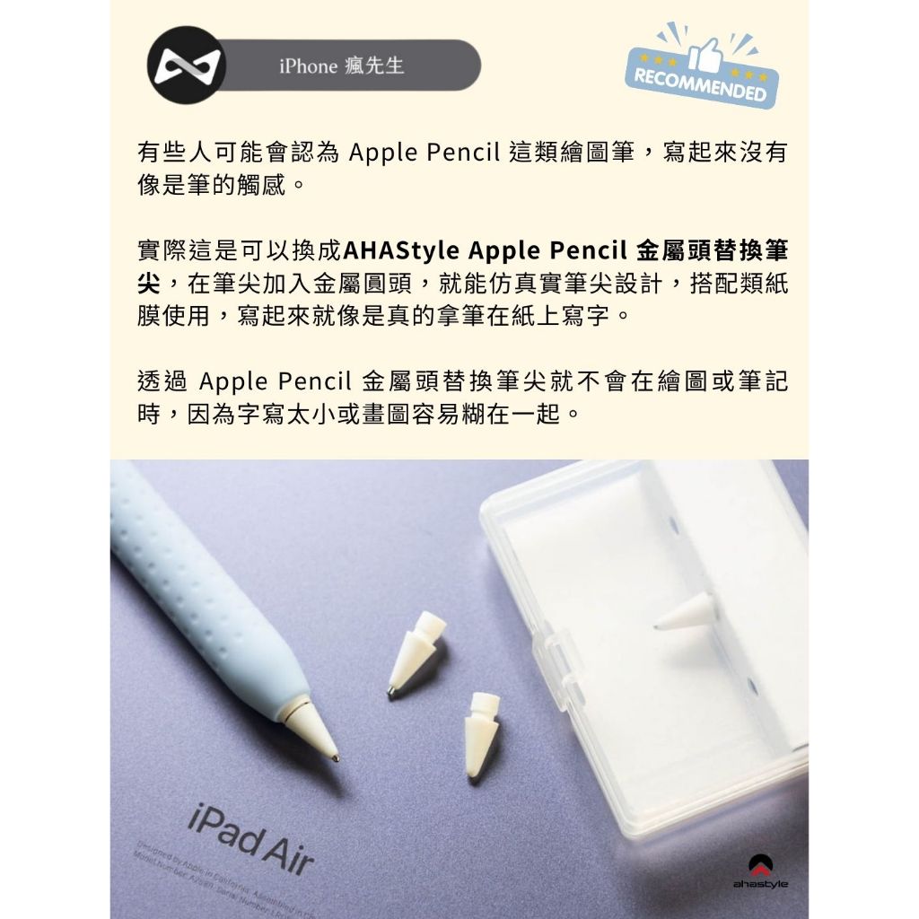 AHAStyle【書寫體驗超值組】Apple Pencil 金屬筆尖頭+玻璃類紙膜金屬筆尖 白色3.5mm,Air 6/7 11吋|金屬筆尖 白色3.5mm,Pro 11吋(2024)|金屬筆尖 白色3.5mm,Pro 12.9吋(2022-2018)|金屬筆尖 白色3.5mm,Air 6/7 13吋|金屬筆尖 白色3.5mm,Pro 13吋(2024)|金屬筆尖 透色3.5mm,Air 6/7 11吋|金屬筆尖 透色3.5mm,Pro 11吋(2024)|金屬筆尖 透色3.5mm,Pro 12.9吋(2022-2018)|金屬筆尖 透色3.5mm,Air 6/7 13吋|金屬筆尖 透色3.5mm,Pro 13吋(2024)|金屬筆尖 白色3.5mm,Air4/5、Pro11(22-18)|金屬筆尖 白色3.5mm,iPad 10/11(A16) 共用|金屬筆尖 白色3.5mm,iPad 7/8/9 10.2吋|金屬筆尖 白色3.5mm,Pro 10.5/Air 3 10.5吋|金屬筆尖 白色3.5mm,mini 6/7 8.3吋|金屬筆尖 透色3.5mm,Air4/5、Pro11(22-18)|金屬筆尖 透色3.5mm,iPad 10/11(A16) 共用|金屬筆尖 透色3.5mm,iPad 7/8/9 10.2吋|金屬筆尖 透色3.5mm,Pro 10.5/Air 3 10.5吋|金屬筆尖 透色3.5mm,mini 6/7 8.3吋Cases, Covers, & SkinsAHAStyle 官方旗艦店