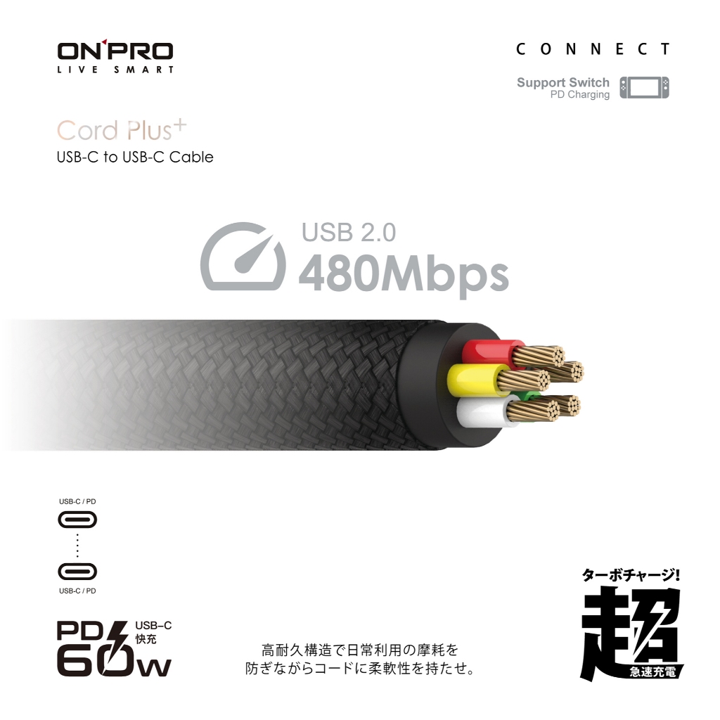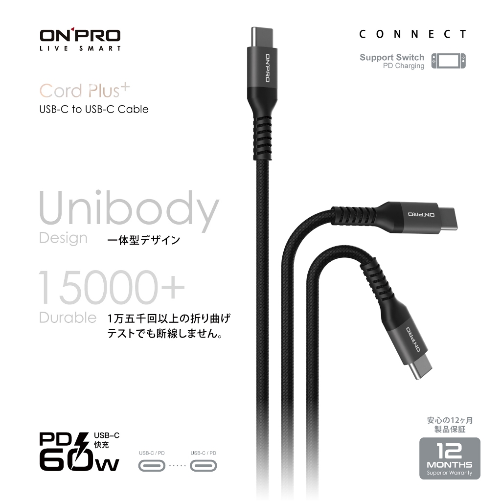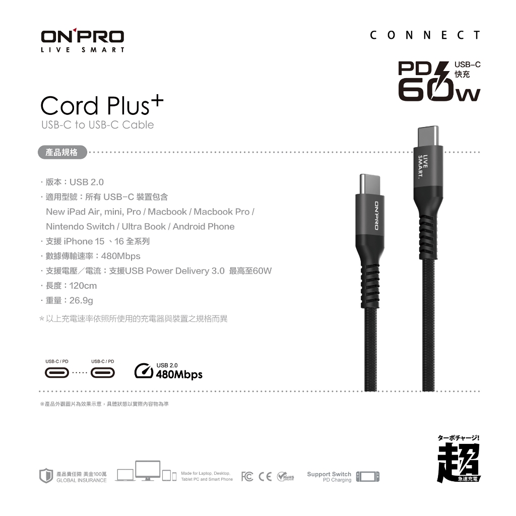 【ONPRO】Cord Plus 1.2M Type-C to Type-C PD60W 快充傳輸線【1.2M】