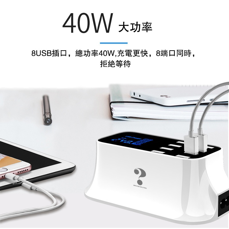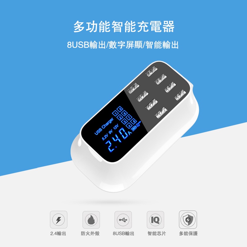 • 八孔液晶usb充電器 適用蘋果IOS/安卓等裝置 2.4a充電器 LCD液晶螢幕 7大保護 智慧型的充電器 液晶充電器