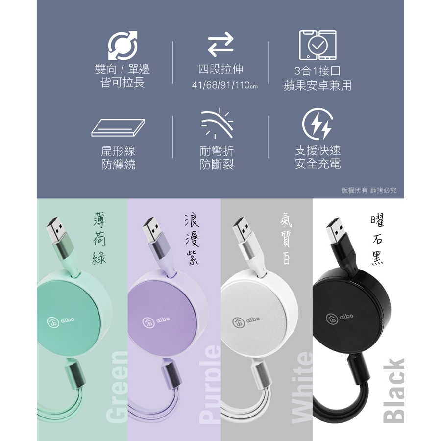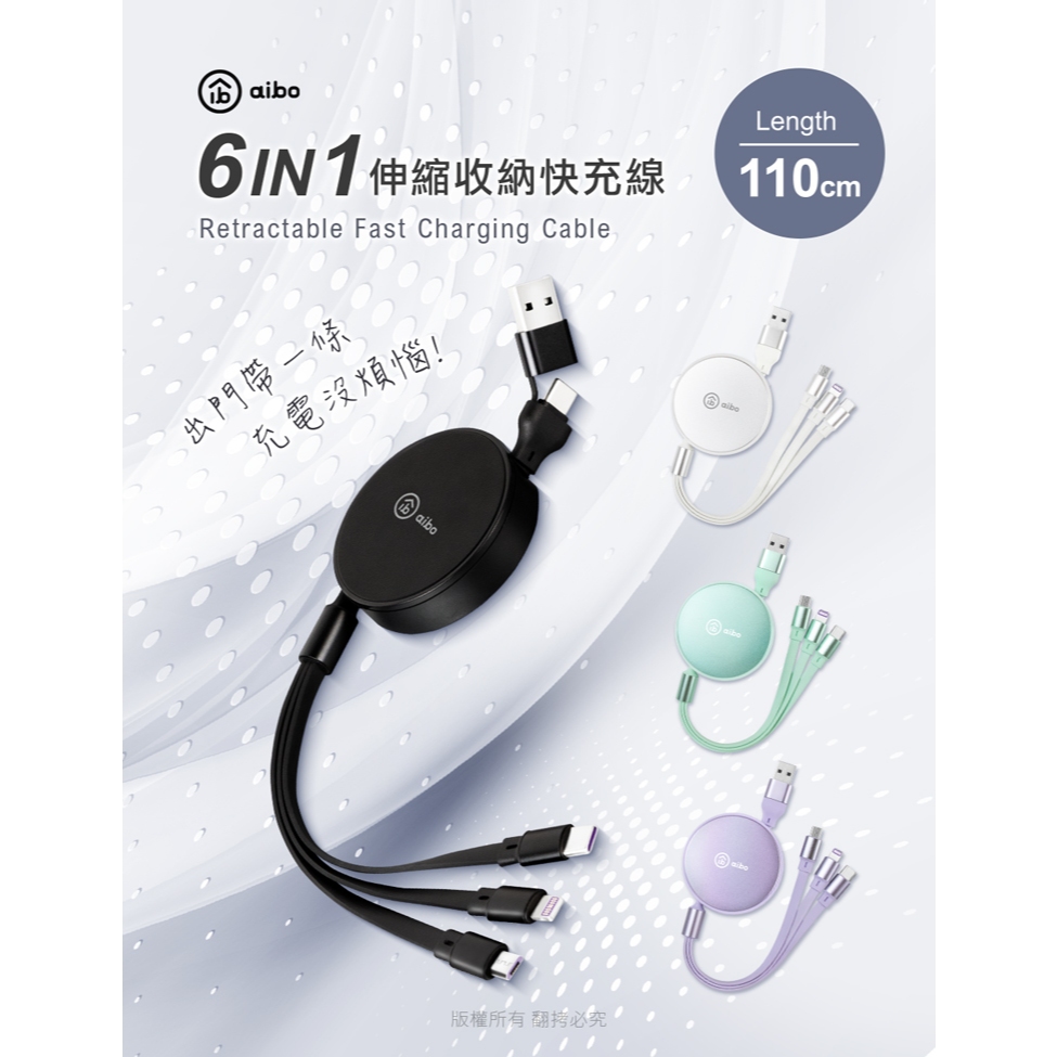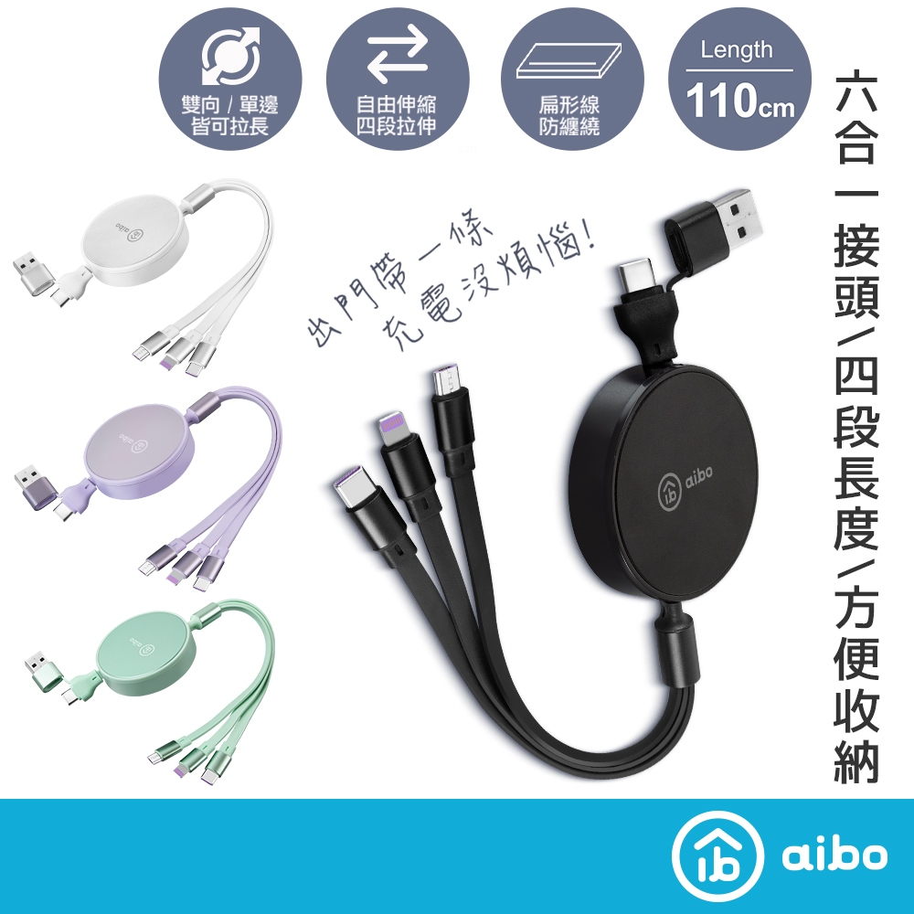 aibo 6合1 伸縮快充線 1.1M【現貨】充電線 Type-C Lightning USB 二拖三 支持15/16曜石黑|薄荷綠|浪漫紫|氣質白Cables, Chargers & Convertersaibo 3C生活館