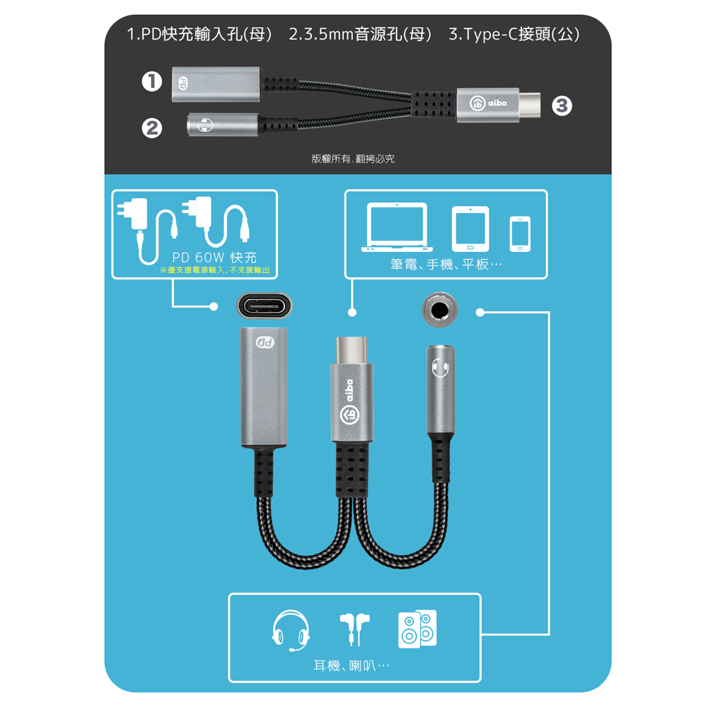 aibo Type-C 轉 3.5mm & Type-C 擴充轉接線 (PD60W快充)【現貨】可外接耳機 喇叭 分線器aibo Type-C 轉 3.5mm & Type-C 擴充轉接線 (PD60W快充)【現貨】可外接耳機 喇叭 分線器Cables, Chargers & Convertersaibo 3C生活館