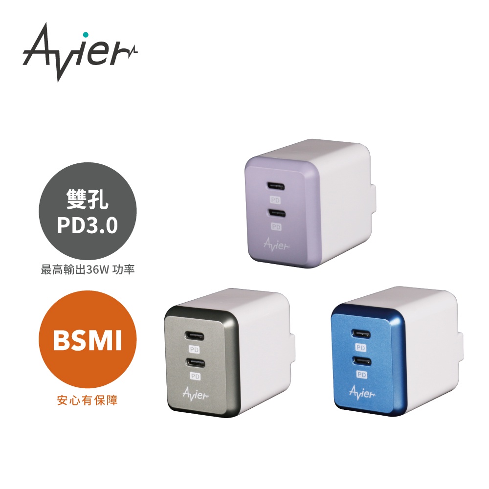 【Avier】COLOR MIX 36W PD 雙孔 充電器 充電頭 快充頭 豆腐頭 Type-C – 三色任選太平洋藍|莫蘭迪紫|石墨灰Cables, Chargers & ConvertersAvier 官方旗艦店