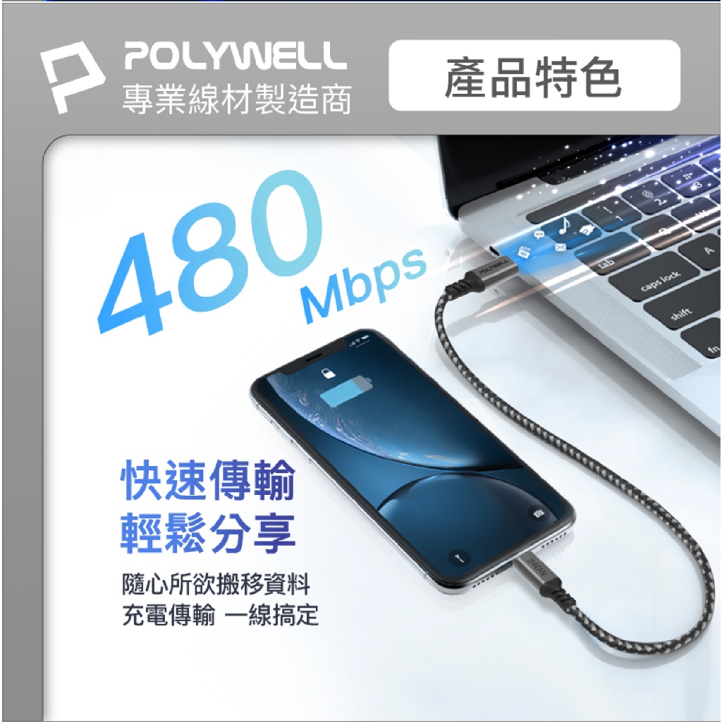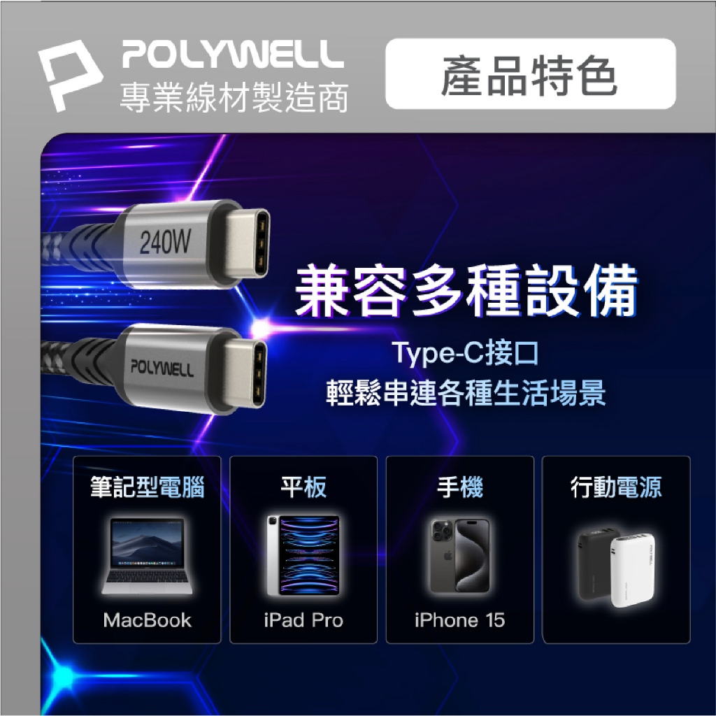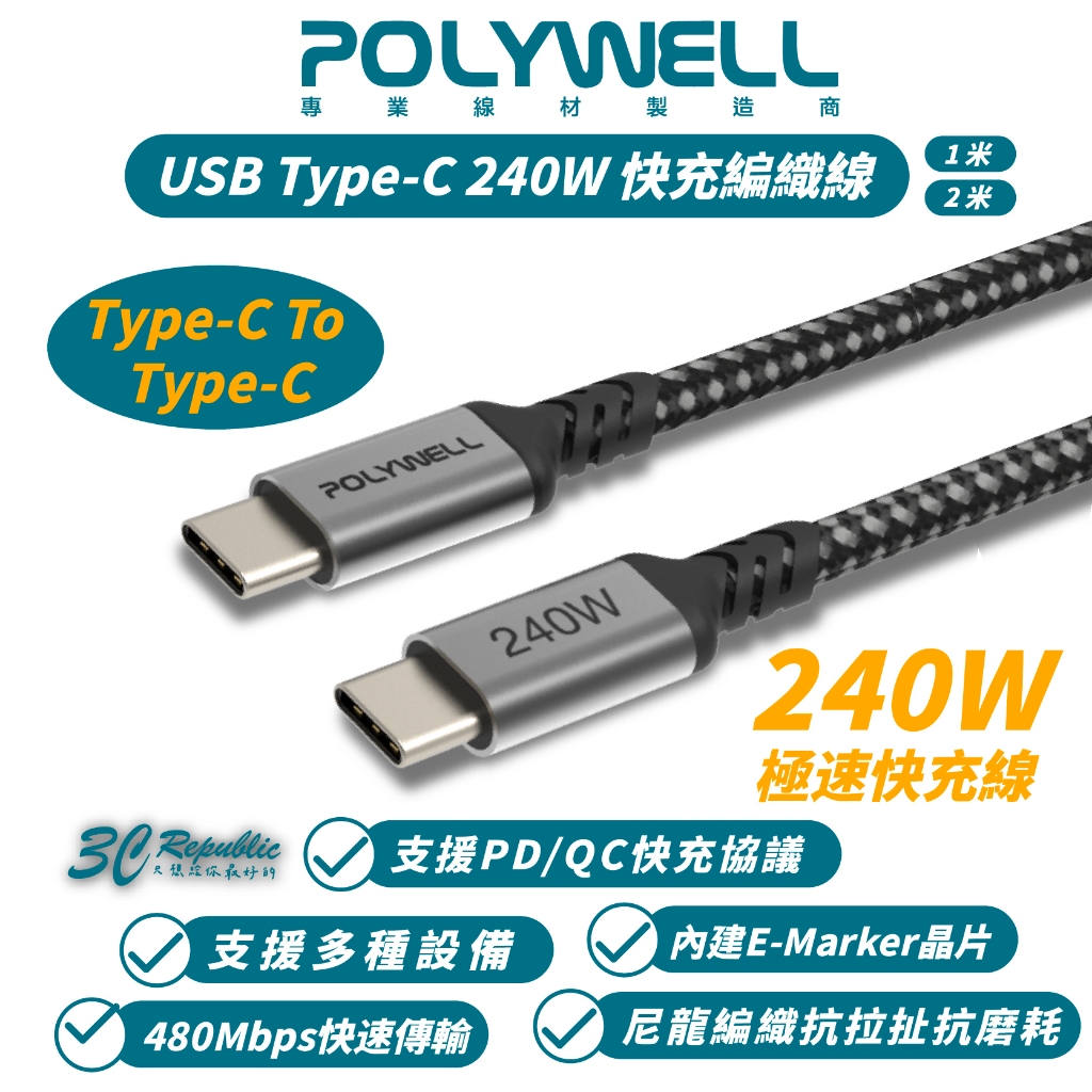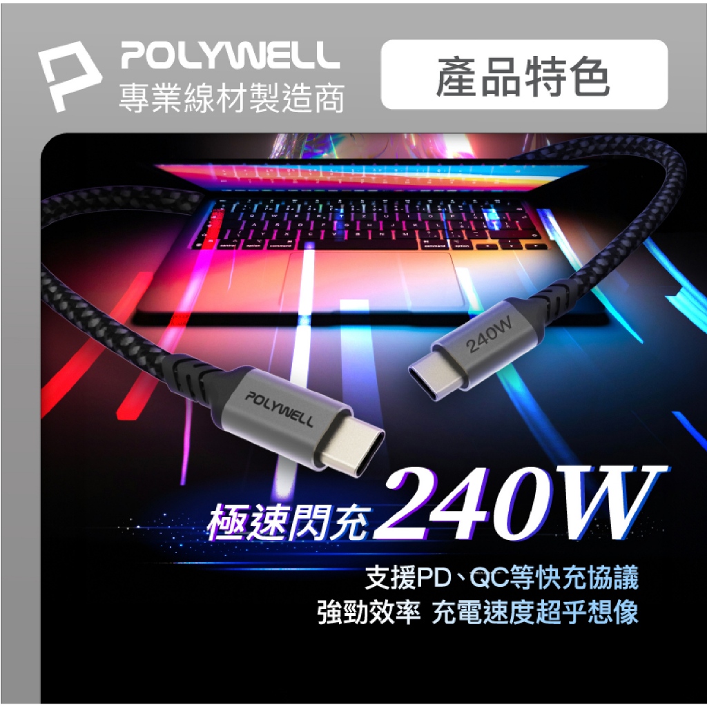 POLYWELL Type C to C 240W 快充線 充電線 傳輸線 適 iPhone 15 14 16 s241米|2米Cables, Chargers & Converters3c共和國