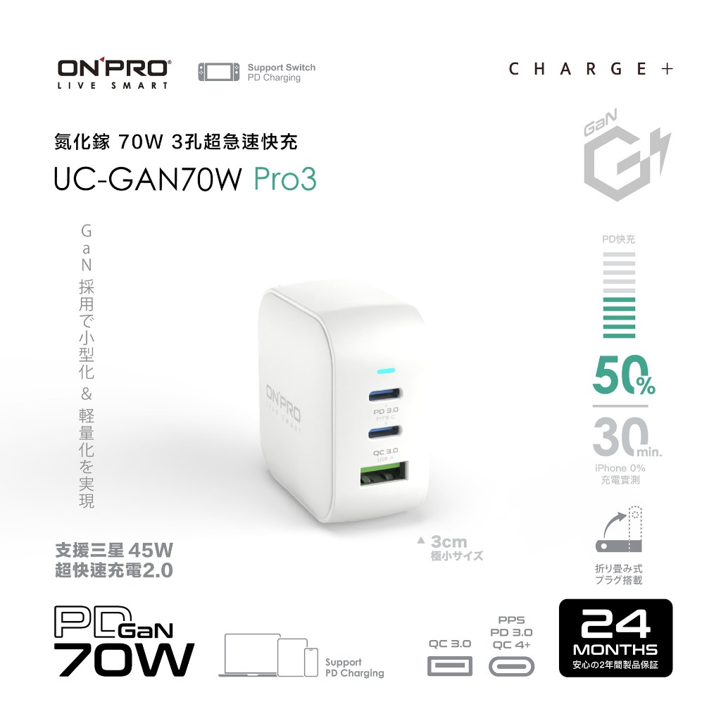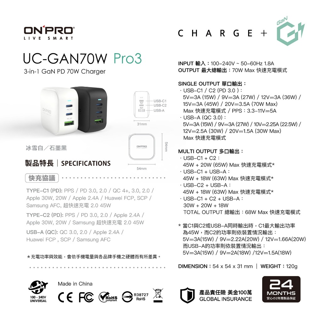 【ONPRO】UC-GAN70W PD70W 3孔 氮化鎵GaN PD快充充電器【Pro3版】石墨黑|冰雪白Cables, Chargers & Converters3C SHOP 數位生活
