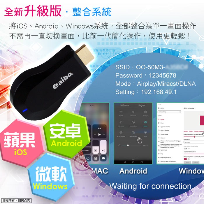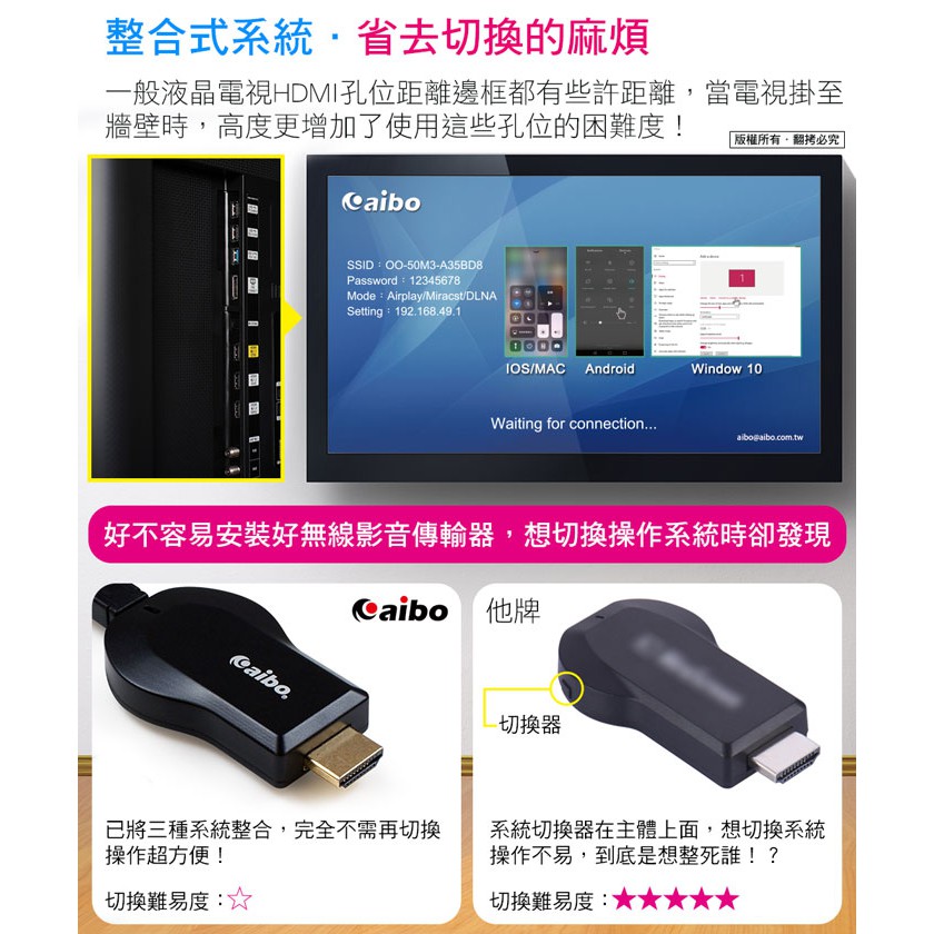 aibo 系統整合升級版 無線Wi-Fi HDMI影音傳輸器 電視棒 手機電視同步 支援最新iOS 同屏器【現貨】aibo 系統整合升級版 無線Wi-Fi HDMI影音傳輸器 電視棒 手機電視同步 支援最新iOS 同屏器【現貨】Casting Devicesaibo 3C生活館