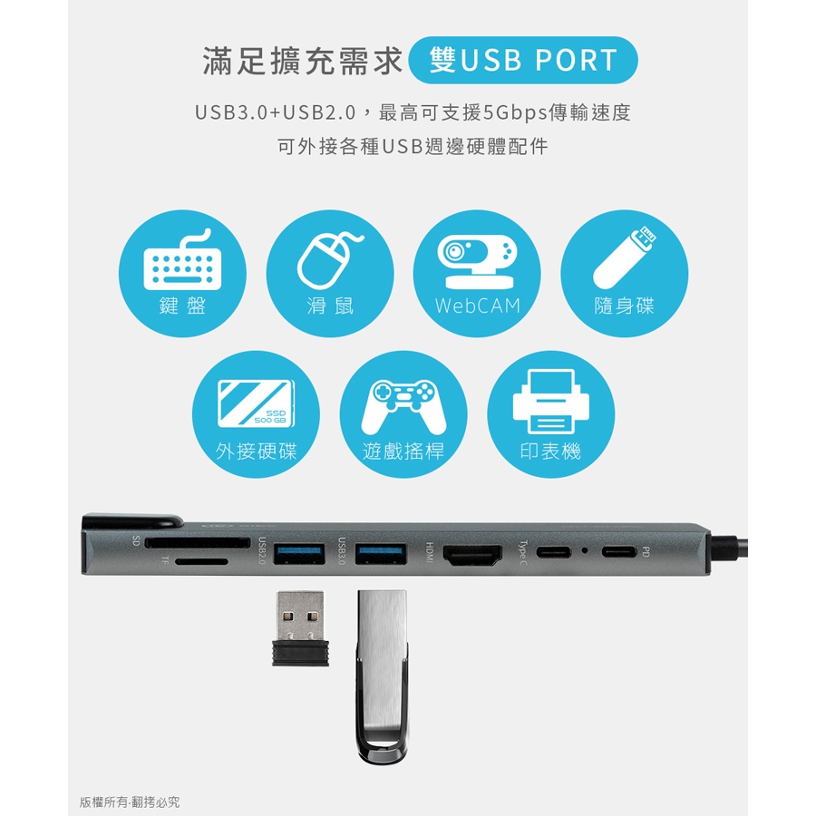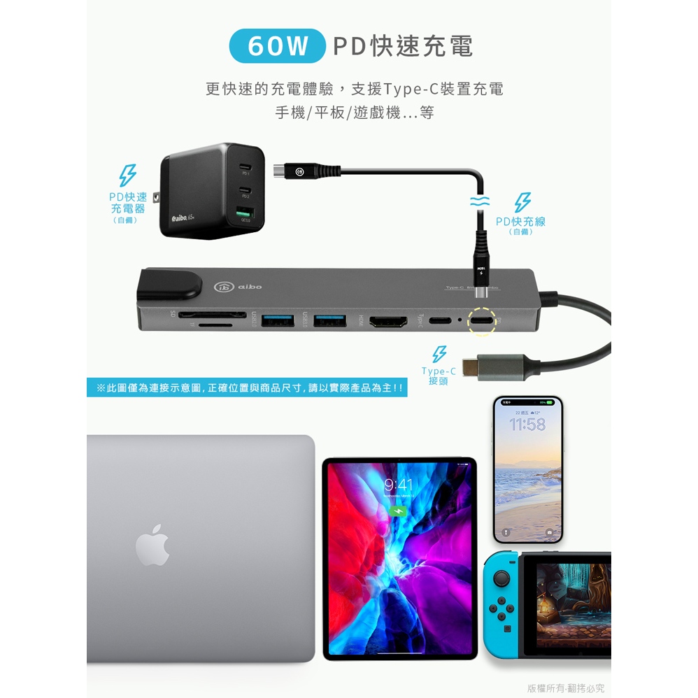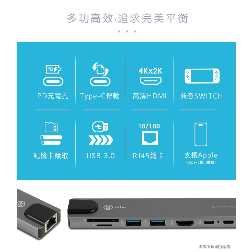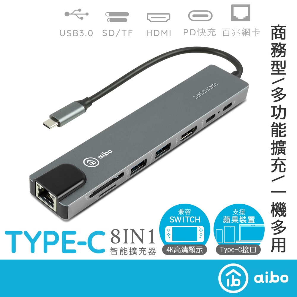 aibo TX8 Type-C 鋁合金八合一多功能影音 智能擴充器【現貨】HUB集線器 兼容SWITCH 分線器 HUB全新品Cables, Chargers & Convertersaibo 3C生活館