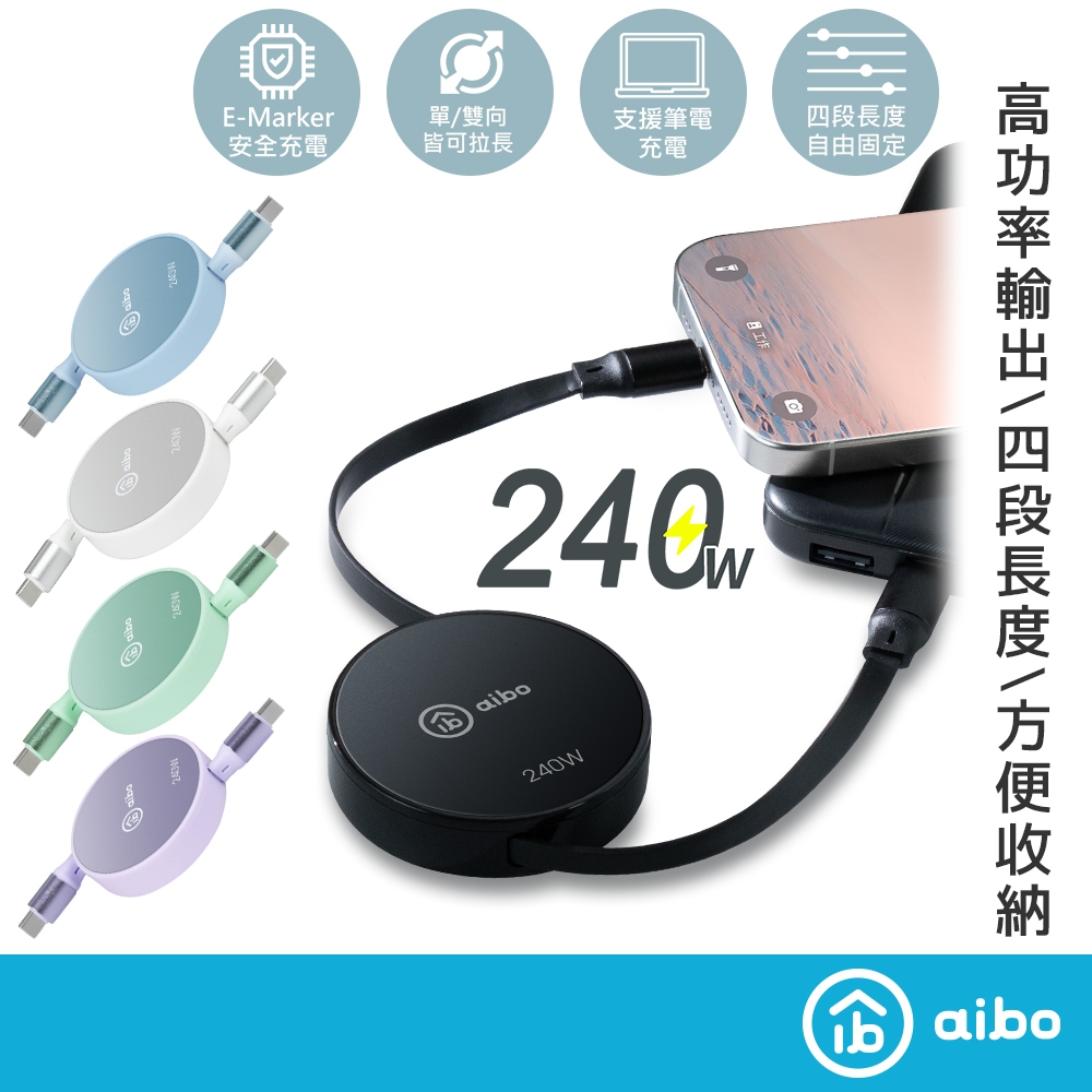 aibo PD 240W快充 雙Type-C伸縮快充線-1M【現貨】Type-C 蘋果快充線 筆電 USB-C 充電線冰峰藍|曜石黑|薄荷綠|浪漫紫|氣質白Cables, Chargers & Convertersaibo 3C生活館