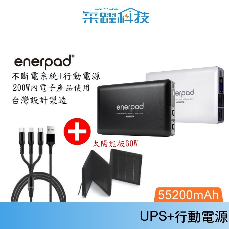 enerpad UPS55K 攜帶式 露營 直流 交流 車泊 行動電源可充手機 平板 筆電 UPS+行動電源 公司貨黑色,單機 +3合一充電線+太陽能板|白色,單機 + 3合一充電線|白色,單機 +3合一充電線+太陽能板|黑色,單機 + 3合一充電線|黑色,單機 + 原廠車充線|白色,單機 + 原廠車充線Powerbanks & Batteries 采躍科技