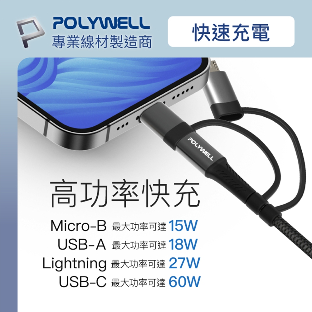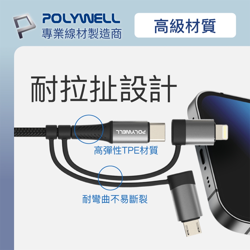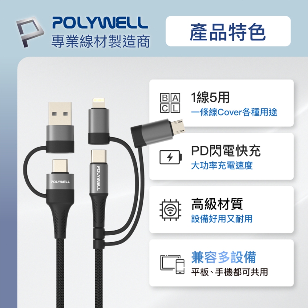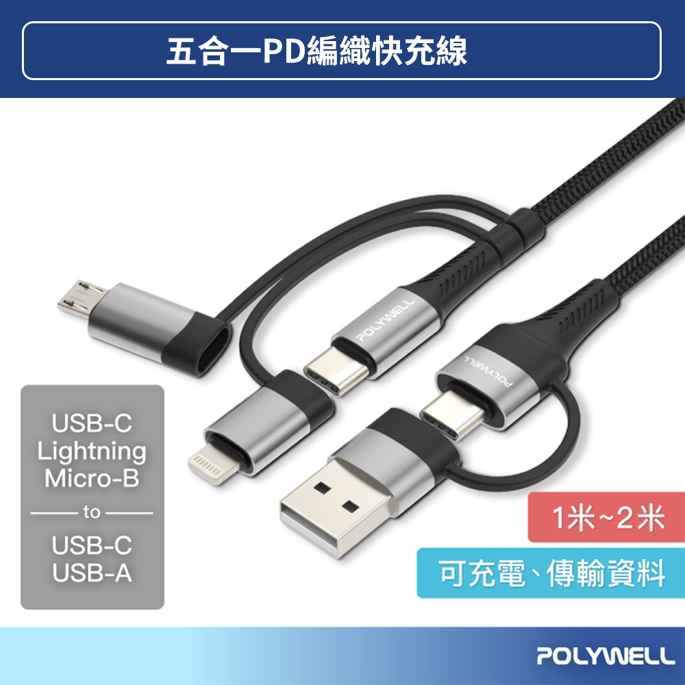 【POLYWELL】寶利威爾 五合一PD編織快充線 1M/2M 一條搞定 充電線 快充線 PLB00511米|2米Cables, Chargers & Converters【隔日配】JHS專營日用品、汽車百貨、3C周邊