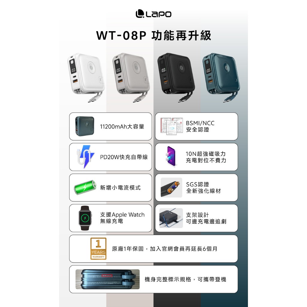 【LAPO】三代升級版 無線快充行動電源WT-08P 最新款3.5代 可出國 有Wh標示 行動電源自帶線 原廠授權經銷琉光金(銀) 現貨供應中,TYPE-C+Lightning(蘋果)|琉光金(銀) 現貨供應中,TYPE-C + TYPE-C|柔霧白 現貨供應中,TYPE-C+Lightning(蘋果)|柔霧白 現貨供應中,TYPE-C + TYPE-C|城影灰 現貨供應中,TYPE-C+Lightning(蘋果)|城影灰 現貨供應中,TYPE-C + TYPE-C|沉靜綠 現貨供應中,TYPE-C+Lightning(蘋果)|沉靜綠 現貨供應中,TYPE-C + TYPE-CPowerbanks & Batteries3C SHOP 數位生活