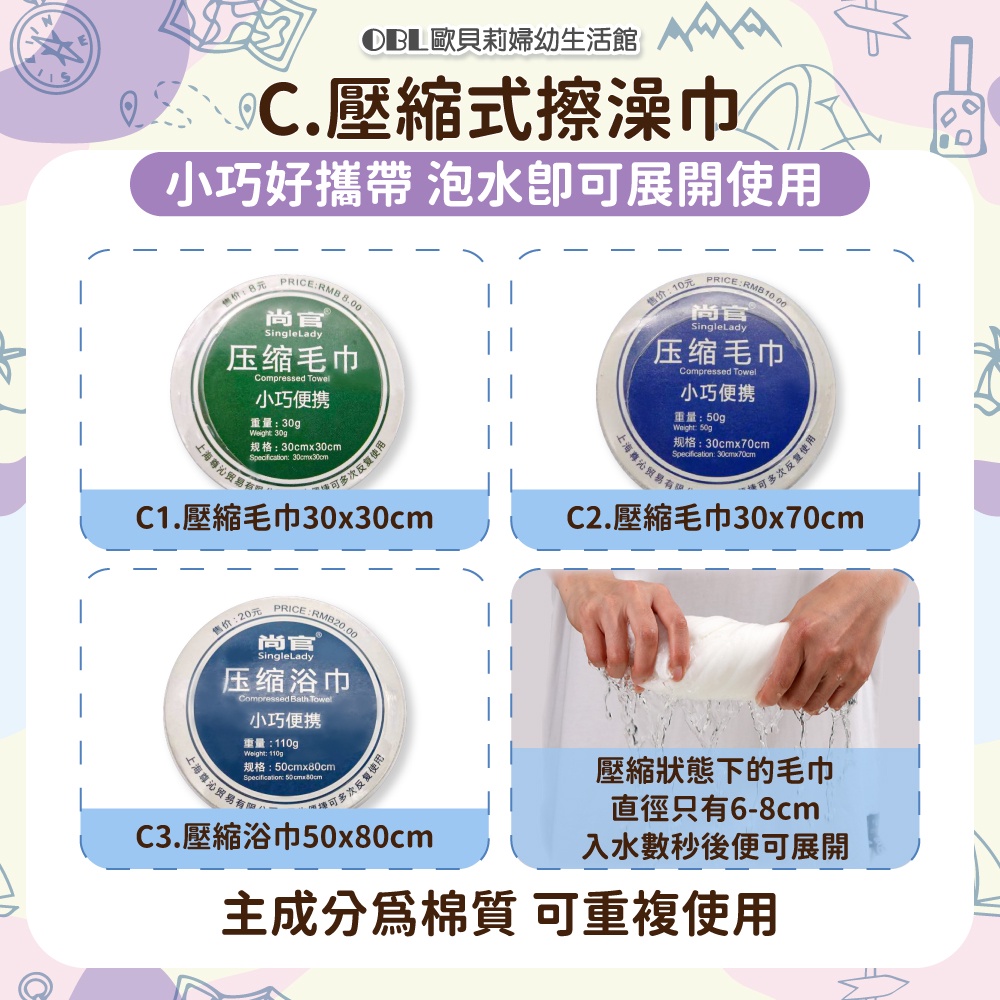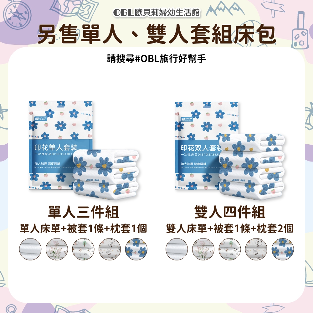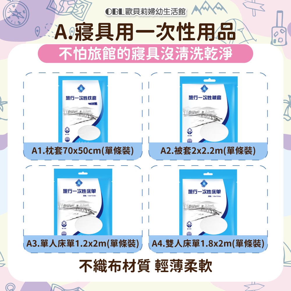 旅行一次性用品 免洗 床單 被單 枕套 毛巾 浴巾 壓縮毛巾 旅行 拋棄式《OBL歐貝莉》A1.枕套70×50 cm (單條裝)|A2.被套 2×2.2 m (單條裝)|A3.單人床單 1.2×2 m(單條裝)|A4.雙人床單1.8×2 m(單條裝)|B1.毛巾(二條裝) 30×70 cm|B2.浴巾(單條裝) 70×140 cm|B3.毛巾+浴巾 (各一條)|C1.壓縮毛巾 (30×30 cm)|C2.壓縮毛巾 (30×70 cm)|C3.壓縮浴巾 (50×80 cm)Bath Robes, Towels & Wash Cloths【OBL 歐貝莉】歐貝莉婦幼生活館
