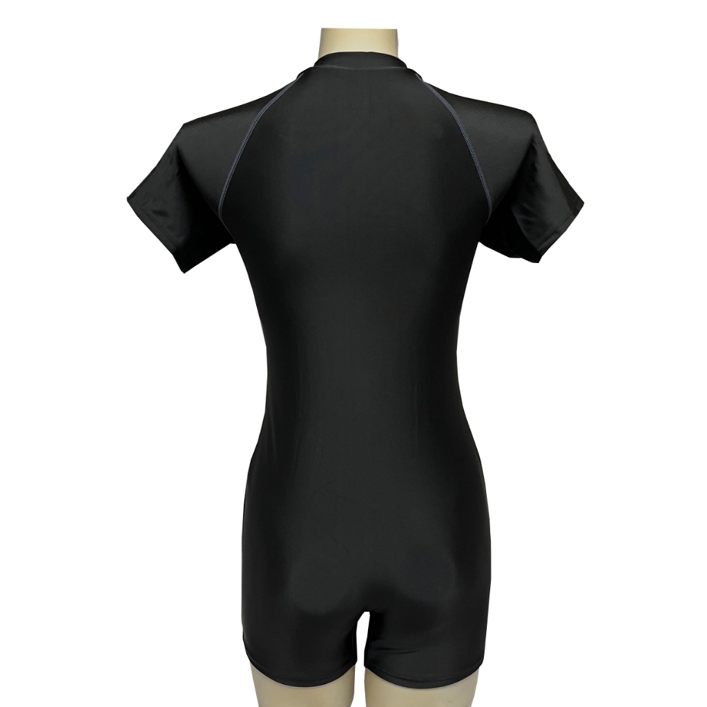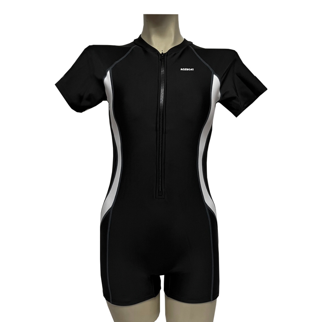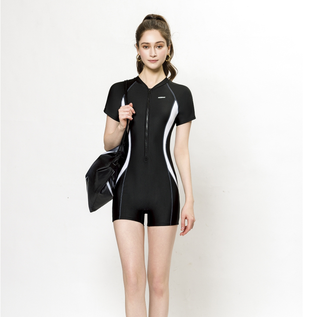 梅林泳裝 大女黑配白邊拉鍊印字短袖連身四角泳衣 贈泳帽 N0-M3418EL|S|M|L|XLSwimming AttireAGE BOAT世紀船泳裝服飾專賣店