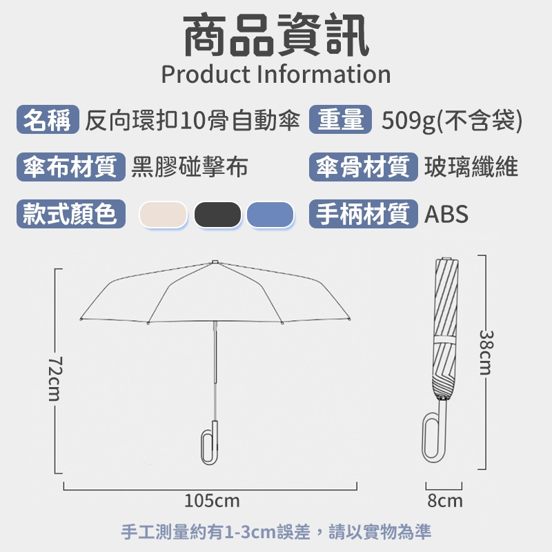 反向環扣自動傘 摺疊傘 晴雨兩用 反向傘 10骨 遮陽傘 雨傘 抗強風 環扣傘 黑膠自動傘【HO12】環扣【反向】10骨自動傘-藏青|環扣【反向】10骨自動傘-經典黑|環扣【反向】10骨自動傘-梧桐米UmbrellasBANG 潮流男女裝服飾、流行生活百貨專賣