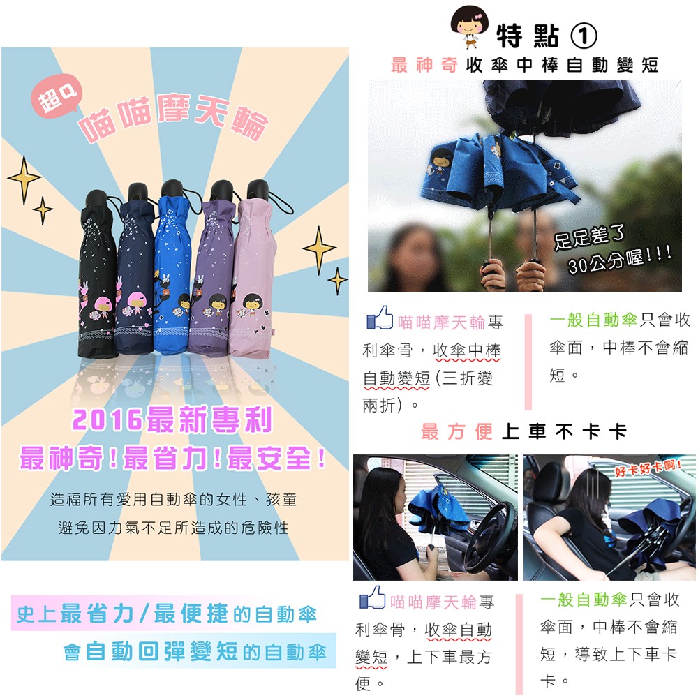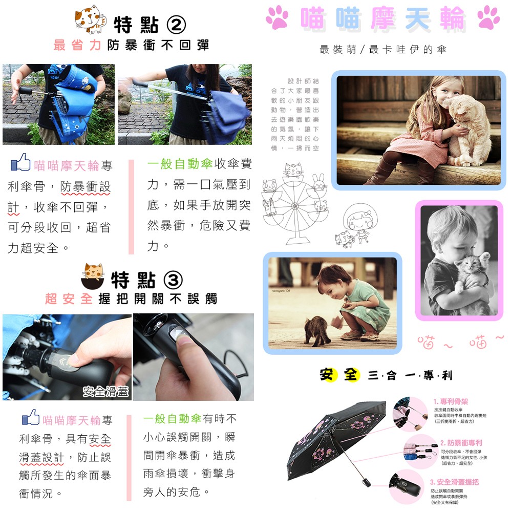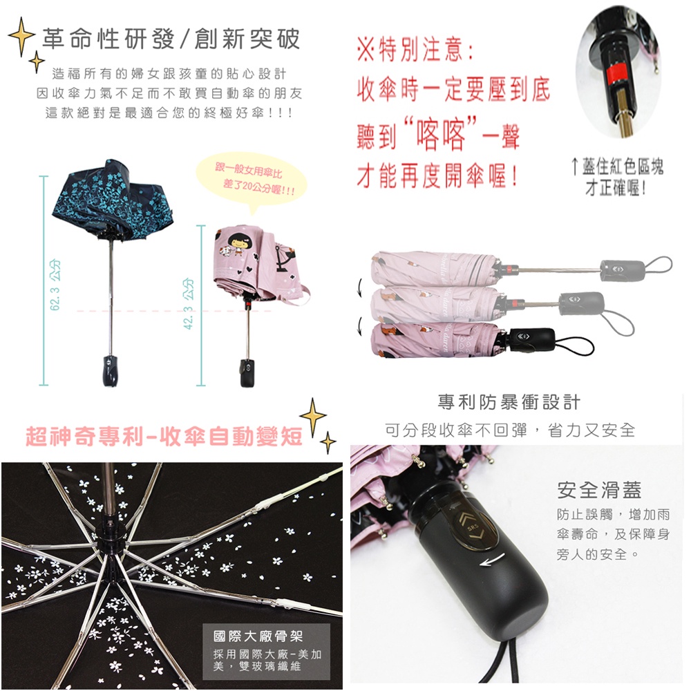 雨傘達人 喵喵摩天輪自動開收傘 2支1100,免運費 ,台灣製造,安全專利防暴衝神奇中棒自動變短超省力,防風防曬遮陽素黑 (無圖案)|素紫 (無圖案)|素深灰 (無圖案)|天使黑 (天使花紋圖案)Umbrellas【雨傘達人★專賣台灣製造好傘】