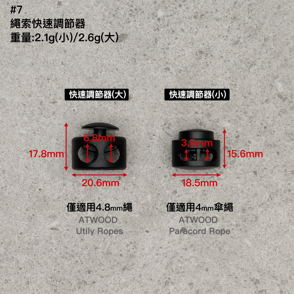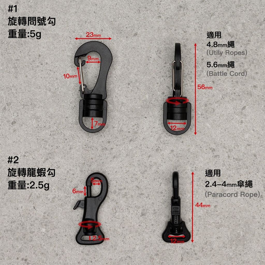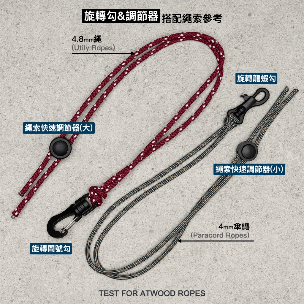【塑鋼釦具】繩尾勾 旋轉勾 露營繩勾 掛繩勾 壓釦 彈力繩插釦旋轉問號勾,同款下單10件出貨11件|旋轉龍蝦勾,同款下單10件出貨11件|繩尾勾(大)2個,同款下單10件出貨11件|繩尾勾(小)2個,同款下單10件出貨11件|彈力繩插釦,同款下單10件出貨11件|雙孔D型釦環,同款下單10件出貨11件|圓形快速調節器(大),同款下單10件出貨11件|圓形快速調節器(小),同款下單10件出貨11件|方形快速調節器,同款下單10件出貨11件Camping & HikingATWOOD ROPES