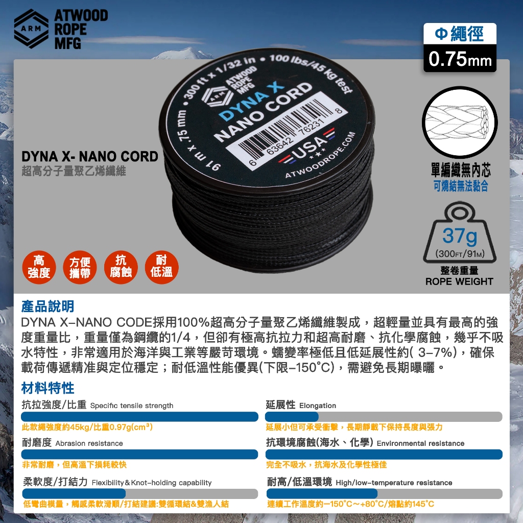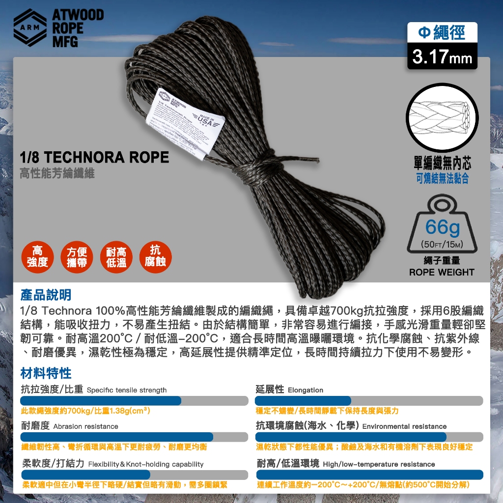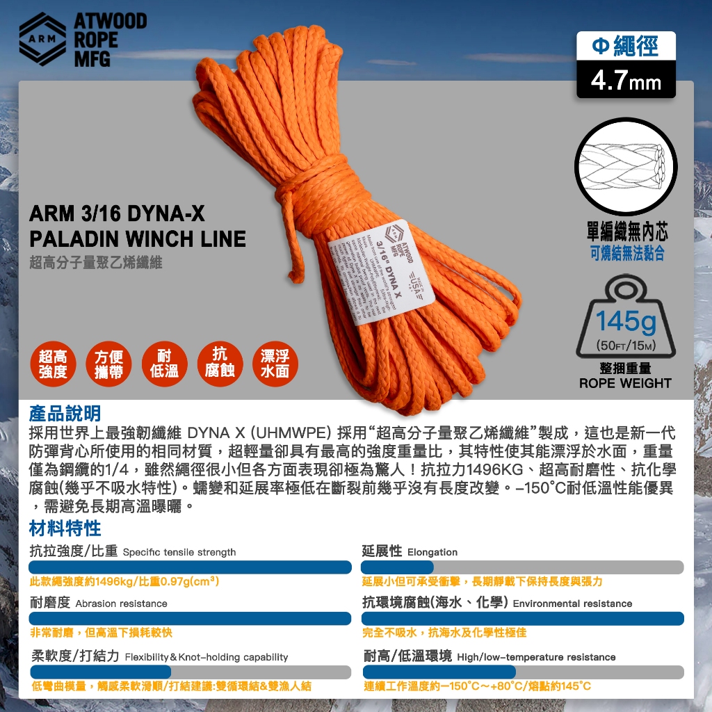 【ATWOOD】超高抗拉力 耐磨抗腐蝕 耐火 DYNA X (UHMWPE) Technora ROPE 芳綸纖維繩.75mm_Dyna X長度114m|1.15mm_Technora長度38m|2mm_Dyna X長度18.6m|3.17mm_Technora長度15m|4.7mm_Dyna X(黑)長度15m|4.7mm_Dyna X(橘)長度15m|9.5mm_Technora長度15mRock ClimbingATWOOD ROPES
