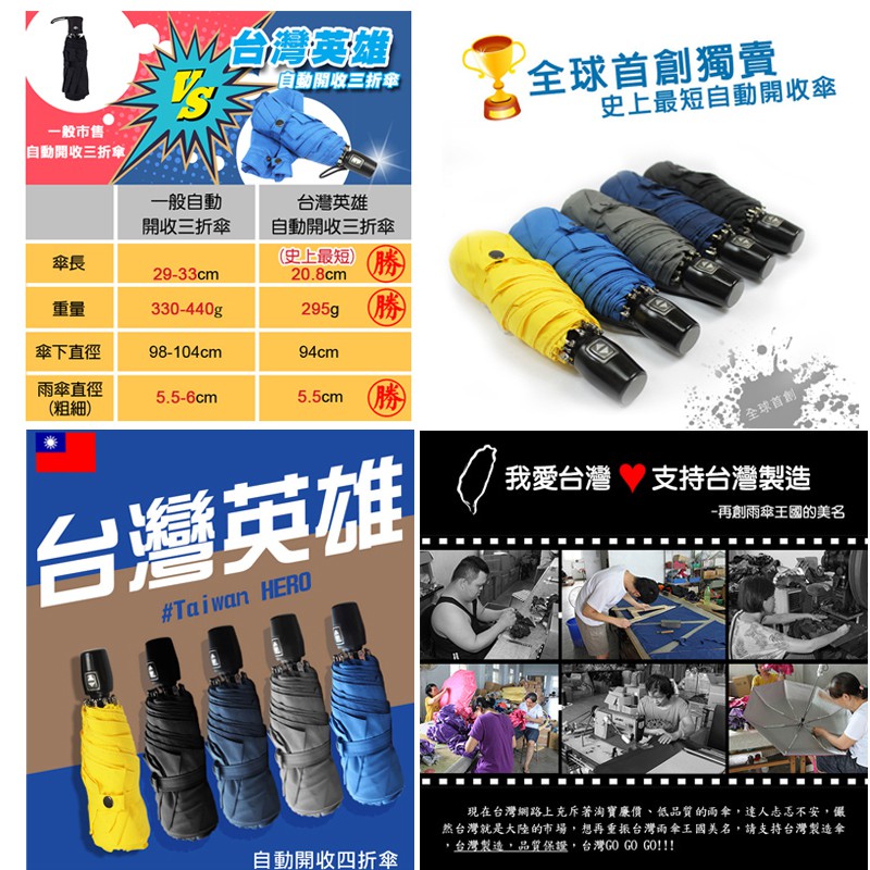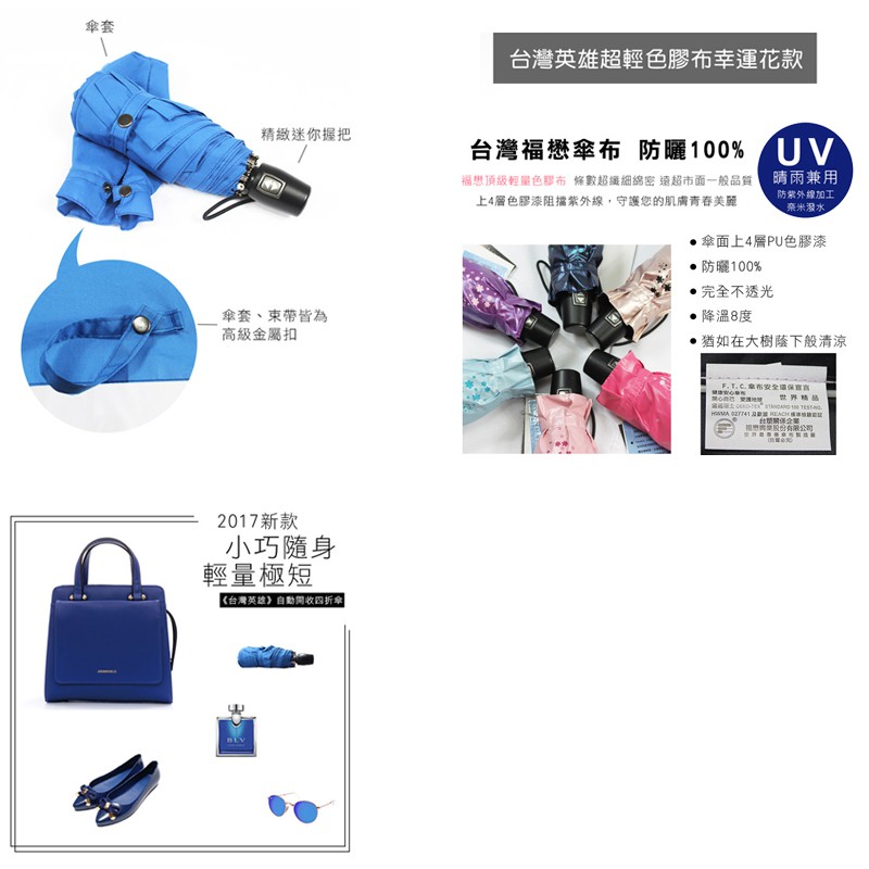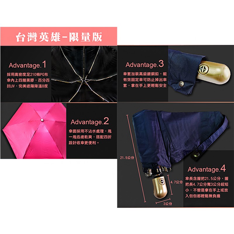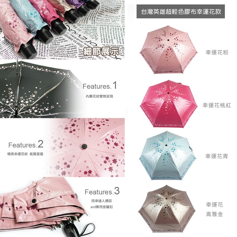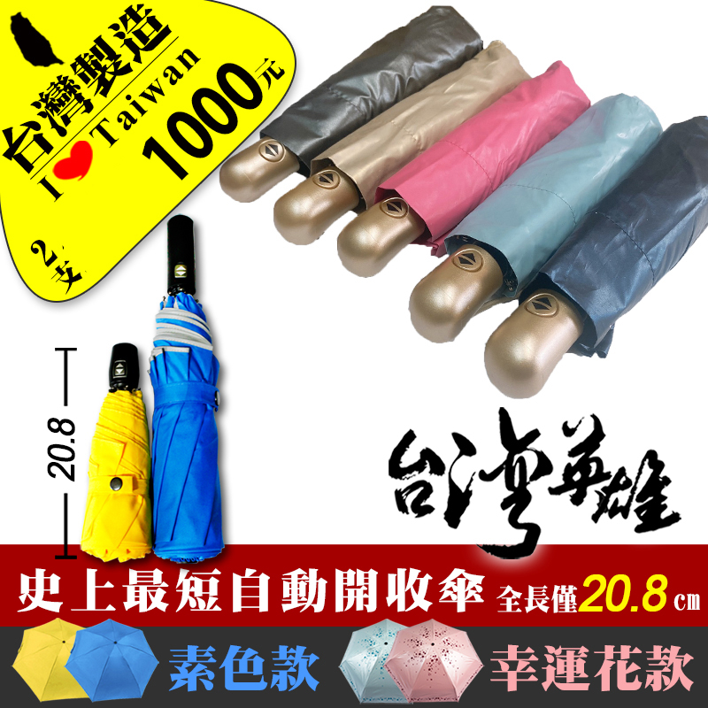 【雨傘達人】台灣英雄自動四折傘【 2支1000】【免運費】【台灣製造】【全球首創最短最好攜帶超輕防曬抗UV100%】幸運花高雅金(防曬色膠布)|神秘紫-傘面上色膠|桃紅色-傘面上色膠|嬌嫩粉-傘面上色膠Umbrellas【雨傘達人★專賣台灣製造好傘】